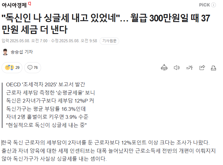 [스크랩] [흥미돋]"독신인 나 싱글세 내고 있었네"… 월급 300만원일 때 37만원 세금 더 낸다 작성자뚱쭝한 고양이|작성시간26.02.10|조회수8,437 목록 댓글 42 글자크기 작게가 글자크기 크게가 출처: https://n.news.naver.com/article/277/0005588867 ㅈㅁ ㅊㅊ 다음검색 스크랩 원문 : *여성시대* 차분한 20대들의 알흠다운 공간 현재 게시글 추가 기능 열기 북마크 공유하기 신고 센터로 신고 댓글 댓글 42 댓글쓰기 답글쓰기 댓글 리스트 작성자Robert Glasper | 작성시간 26.02.10 벙글세 내라 작성자clairo | 작성시간 26.02.10 내돈내놔씨발 작성자맹고스므듸 | 작성시간 26.02.10 이러면 하준이동현이자식새끼 잘 키우란말야 제발 ㅅㅂ 작성자너구나 | 작성시간 26.02.10 세금은 비혼한테 존나 뜯어가고 복지나 혜택은 기혼한테 존나주고 샤갈그래도 안해 ㅡㅡ 작성자메롱빵사줘 | 작성시간 26.02.10 ㅁㅊ ㅡㅡ 에바야 내놔 댓글 전체보기