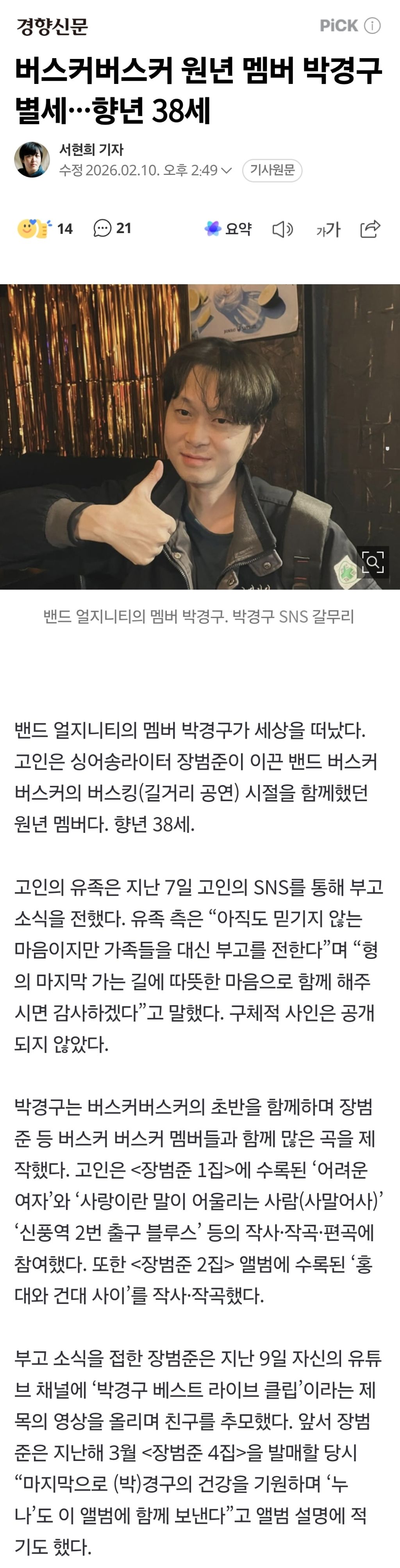 [여시뉴스데스크]버스커버스커 원년 멤버 박경구 별세···향년 38세 작성자퇴사하고싶고그런상태|작성시간26.02.10|조회수37,775 목록 댓글 42 글자크기 작게가 글자크기 크게가 출처: https://n.news.naver.com/article/032/0003426939?sid=103버스커 버스커 원년멤버 박경구 사망…향년 38세밴드 얼지니티의 멤버 박경구가 세상을 떠났다. 고인은 싱어송라이터 장범준이 이끈 밴드 버스커버스커의 버스킹(길거리 공연) 시절을 함께했던 원년멤버다. 향년 38세. 고인의 유족은 지난 7일 n.news.naver.com 다음검색 현재 게시글 추가 기능 열기 북마크 공유하기 신고 센터로 신고 댓글 댓글 42 댓글쓰기 답글쓰기 댓글 리스트 작성자everyday.. | 작성시간 26.02.11 삼가 고인의 명복을 빕니다 작성자공쥬핑。 | 작성시간 26.02.11 삼가 고인의 명복을 빕니다 작성자고양이딸기 | 작성시간 26.02.11 삼가 고인의 명복을 빕니다 작성자두부두루치기 | 작성시간 26.02.11 삼가 고인의 명복을 빕니다 작성자갭상승 | 작성시간 26.02.11 삼가 고인의 명복을 빕니다 댓글 전체보기