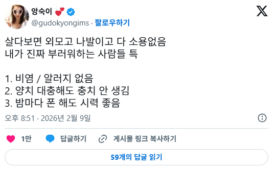 [흥미돋]살다보면 외모고 나발이고 다 소용없음 내가 진짜 부러워하는 사람들 특 작성자귤토끼이|작성시간26.02.10|조회수95,835 목록 댓글 57 글자크기 작게가 글자크기 크게가 출처: https://theqoo.net/square/4090283529 https://x.com/gudokyongims/status/2020827901135048836?s=20 다음검색 현재 게시글 추가 기능 열기 북마크 공유하기 신고 센터로 신고 댓글 댓글 57 댓글쓰기 답글쓰기 댓글 리스트 작성자히비스커스 티 | 작성시간 26.02.10 2밖에 없누ㅠ 비염에 안경끼고 있어요ㅜ 작성자볼파이톤 | 작성시간 26.02.10 +장 튼튼한 사람 작성자평화퐁 | 작성시간 26.02.10 ㄹㅇ 비염있고 치과 갈 예정이고 시력안좋고 망막에 문제있어서 슬프다 건강한 게 최고야 작성자Amoroso | 작성시간 26.02.10 1,2 제일 부럽… 충치 치료에 200 태움 작성자명랑핫도 | 작성시간 26.02.10 허리목튼튼한사람... 댓글 전체보기