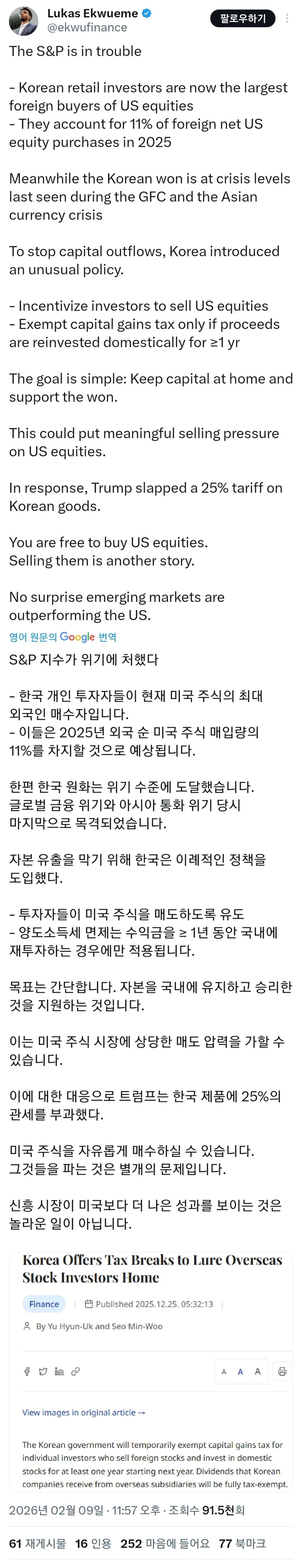작성자sabrinalove 작성시간 26.02.10 한국인들이 뭐 세금 그런거 생각하면서 투자하겠냐 환율도 좆까 하는 와중에ㅋㅋㅋㅋㅋㅋ걍 지금 미장이 노잼임