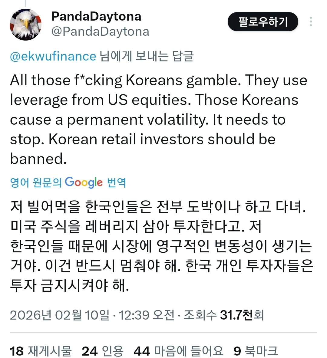 작성자아모말파티 작성시간 26.02.10 니들이 한쿡에서 하는건 괜찮고? 와서 코스피 팍팍 올리던가