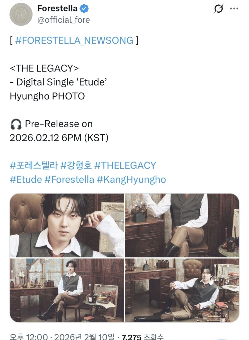 [흥미돋]전 화학연구원 강형호와 딱맞는 포레스텔라 컨셉포토 작성자냥냥멍멍이|작성시간26.02.10|조회수10,913 목록 댓글 8 글자크기 작게가 글자크기 크게가 출처: 여성시대 (냥냥멍멍이)https://x.com/i/status/2021056545258143911X의 Forestella님(@official_fore)[ #FORESTELLA_NEWSONG ] <THE LEGACY> - Digital Single ‘Etude’ Hyungho PHOTO 🎧 Pre-Release on 2026.02.12 6PM (KST) #포레스텔라 #강형호 #THELEGACY #Etude #Forestella #KangHyunghox.com(부산대 화공과 롯데bp 화학연구원 주임(대리까지달음) 출신) 다음검색 현재 게시글 추가 기능 열기 북마크 공유하기 신고 센터로 신고 댓글 댓글 8 댓글쓰기 답글쓰기 댓글 리스트 작성자소금우유크림빵 | 작성시간 26.02.10 대리님 웨딩촬영하셨네... 좀 웃으시지 작성자승냥이 | 작성시간 26.02.10 ㅋㅋㅋ약간 동네 사진관 인물사진 고급버젼같닼ㅋㅋ 작성자두바이쫀득찹쌀떡 | 작성시간 26.02.10 ㅋㅋㅋㅋ 작성자빠하로스 | 작성시간 26.02.10 논문도 썼던 대리님 간만에 실험기구들 만져서 신났을듯 ㅋㅋㅋㅋㅋ 작성자간장버터참치캔 | 작성시간 26.02.10 전생 화보인갘ㅋㅋㅋㅋㅋㅋㅋ 댓글 전체보기