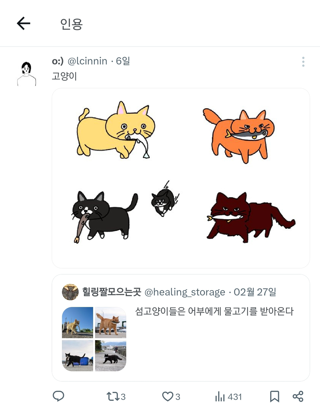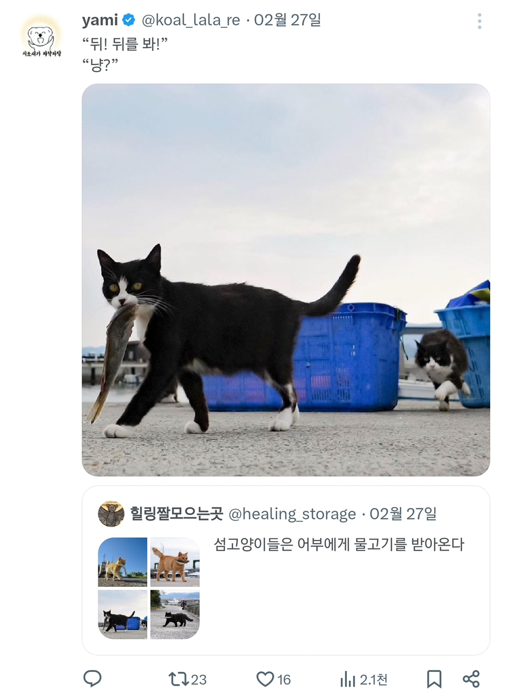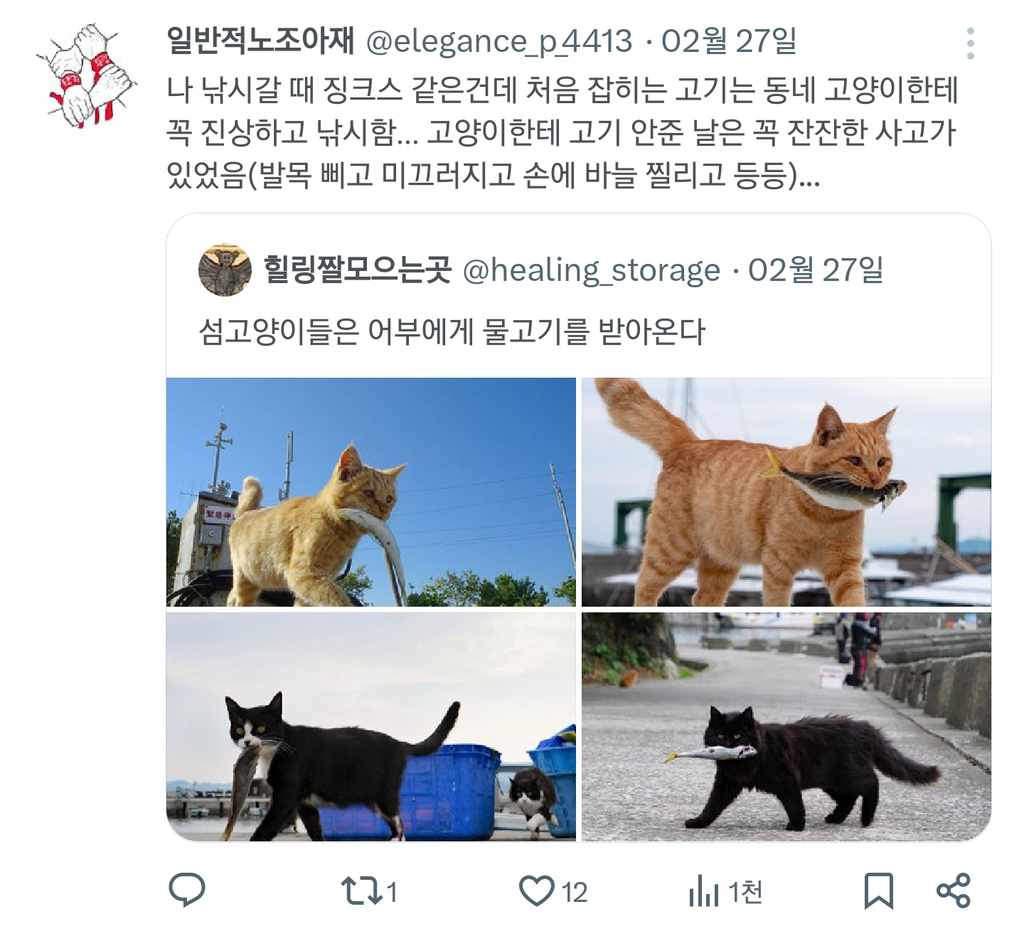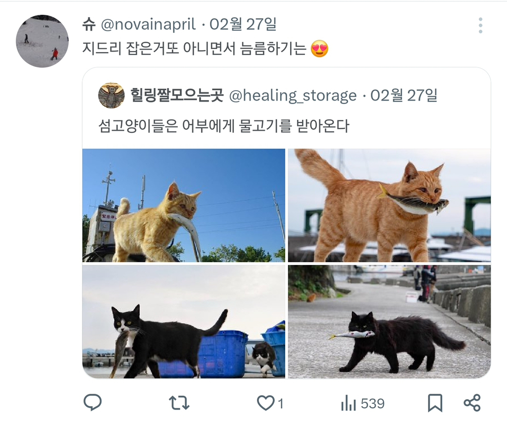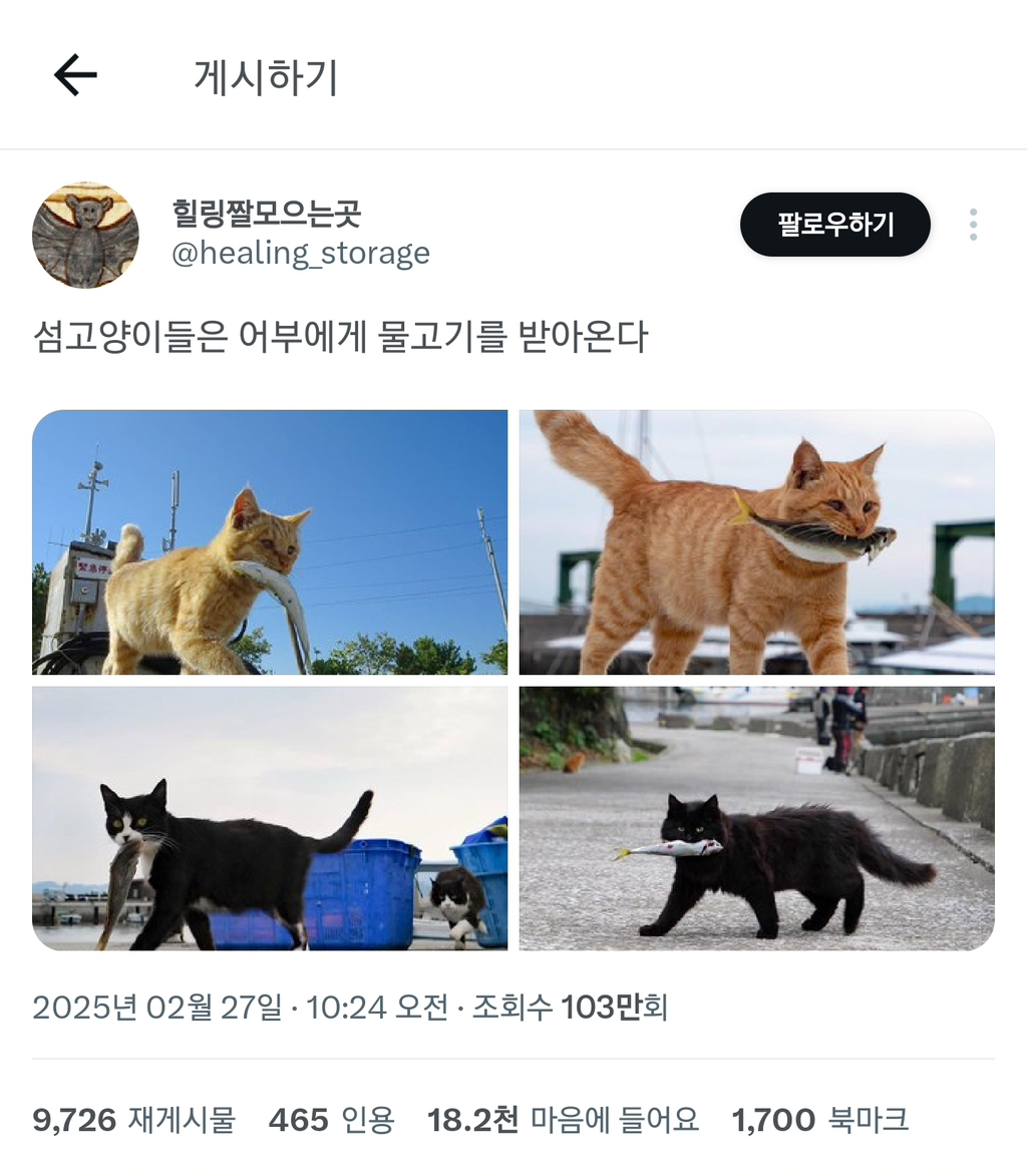 [스크랩] [흥미돋]섬고양이들은 어부에게 물고기를 받아온다. 작성자Night|작성시간26.02.10|조회수9,347 목록 댓글 13 글자크기 작게가 글자크기 크게가 출처: https://m.cafe.daum.net/subdued20club/ReHf/5235871?svc=topRank&섬고양이들은 어부에게 물고기를 받아온다.소울드레서는 우리가 만들어가는 소중한 공간입니다.댓글 작성 시 타인에 대한 배려와 책임을 다해주세요.생선 맛집웨 안죠 빼액편식하냥새우는 줘도 안 먹어m.cafe.daum.nethttps://youtu.be/2-5bAN9HdaE?si=imSS9gmpeG-PzSybhttps://youtu.be/pJjCeHtA1bQ?si=1L5vAoq_yIisQGmchttps://youtu.be/PxKeqYoYrH4?si=8SZKmbcJ73HSYmMyhttps://youtu.be/Iwo6JMoAjUI?si=lpsJNf-hgmOX6-34 다음검색 스크랩 원문 : *여성시대* 차분한 20대들의 알흠다운 공간 현재 게시글 추가 기능 열기 북마크 공유하기 신고 센터로 신고 댓글 댓글 13 댓글쓰기 답글쓰기 댓글 리스트 작성자호롤롤ㄹ로롤 | 작성시간 26.02.10 많이 먹고 행복해 애기들아 작성자해피 샌드위치 | 작성시간 26.02.10 쇼츠 태그에 #도둑 있는 것도 웃기고 영상 영어자막 난리났다 ㅋㅋㅋㅋㅋㅋ 개웃기고 냥헴들 귀여워 ㅠ 작성자스마부미 | 작성시간 26.02.10 이거 보고 나도 선장님 생각났어ㅋㅋㅋㅋ 작성자샤인머섯켓 | 작성시간 26.02.10 고지 고지notice notice영어 자막 개웃기네ㅋㅋㅋㅋㅋㅋㅋ 작성자암국 | 작성시간 26.02.10 ㄱㅇㅇ 댓글 전체보기