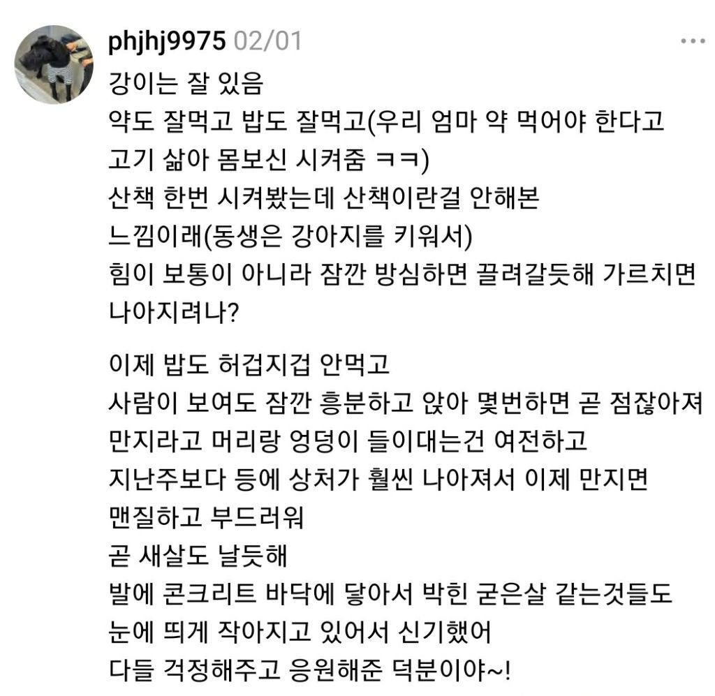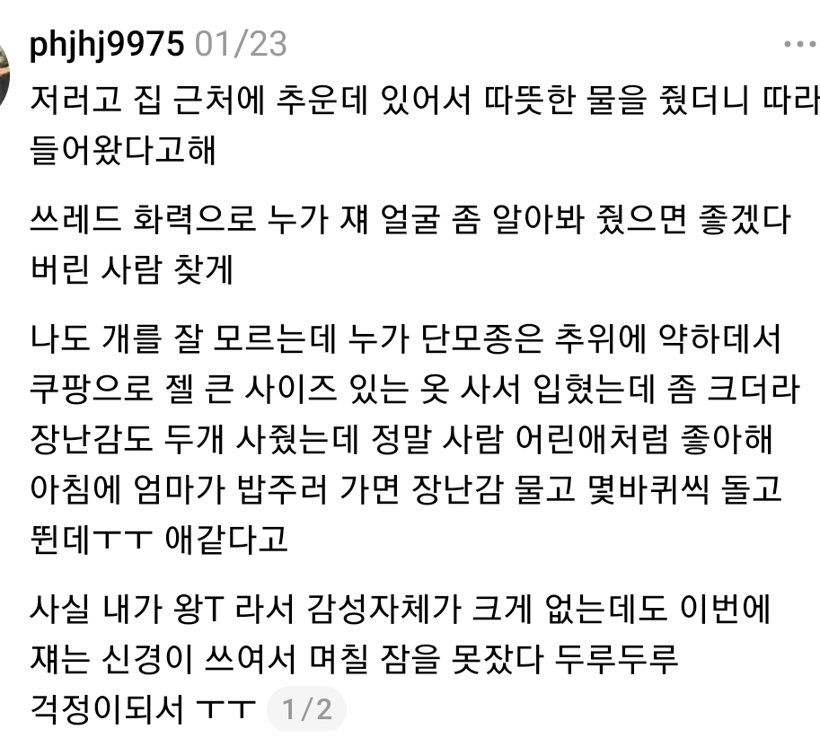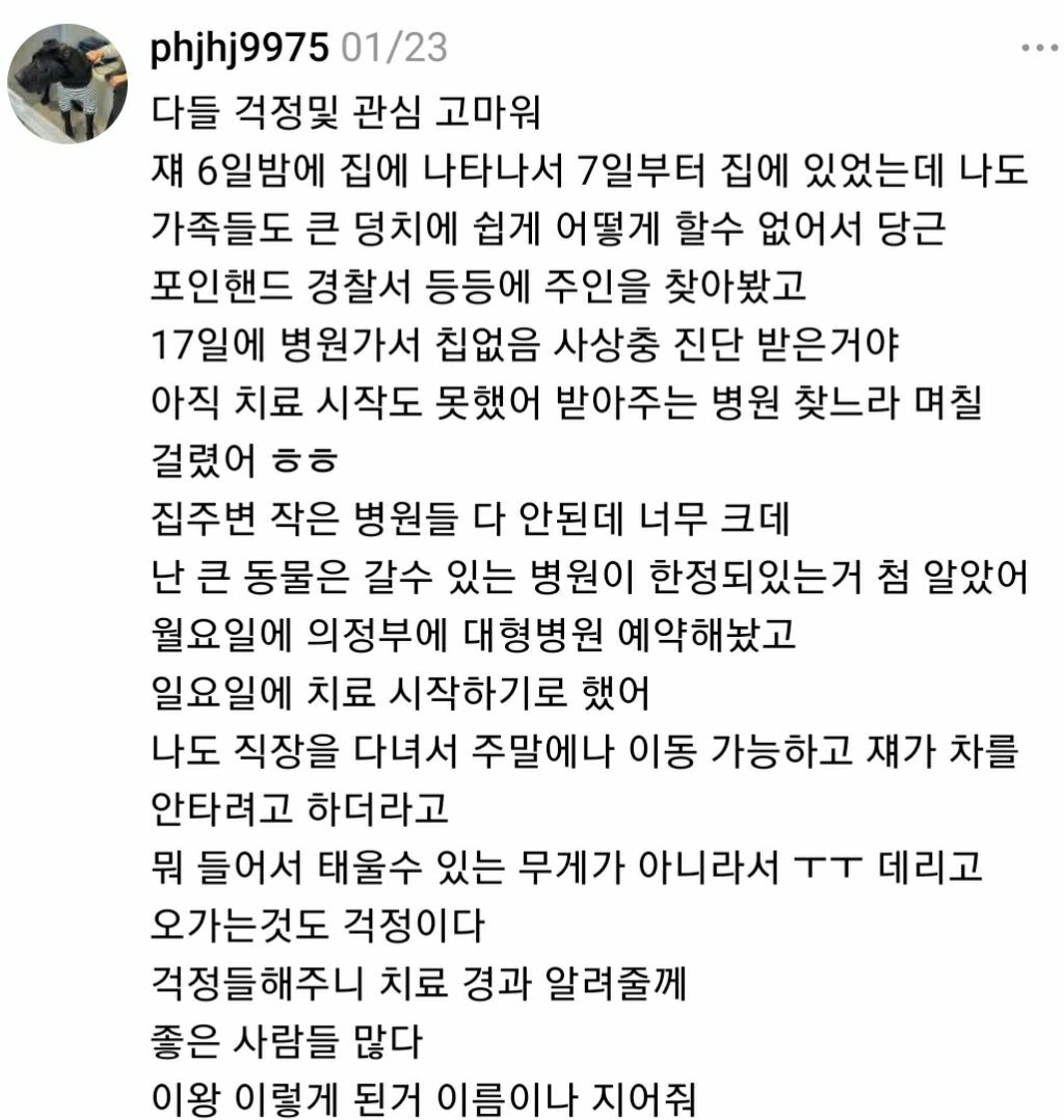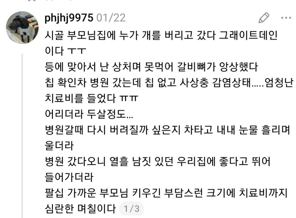 [스크랩] [기타]부모님 집 앞에 버려진 그레이트데인 임시보호 중인 스레드인 작성자사파이어|작성시간26.02.10|조회수85,344 목록 댓글 313 글자크기 작게가 글자크기 크게가 소울드레서는 우리가 만들어가는 소중한 공간입니다.댓글 작성 시 타인에 대한 배려와 책임을 다해주세요.클릭하면 원문으로 이동 다음검색 스크랩 원문 : 비공개카페 현재 게시글 추가 기능 열기 북마크 공유하기 신고 센터로 신고 댓글 댓글 313 댓글쓰기 답글쓰기 댓글 리스트 작성자낭낭낭반지 | 작성시간 26.02.12 아유ㅠㅠㅠ 작성자간지나게 | 작성시간 26.02.12 아 우는 거 마음 찢어져 작성자이파리파 | 작성시간 26.02.12 ㅜㅜㅜㅜㅜ 작성자약선 | 작성시간 26.02.13 강아지랑 만난 분들이 다들 좋은 분들이셔서 다행이다...ㅠㅠ 좋은 입양처 정해져서 행복하게 살아라 제발 작성자그걸왜줘 | 작성시간 26.02.21 아니대체 하 진짜 열받고 강아지 우는거 짠해 댓글 전체보기