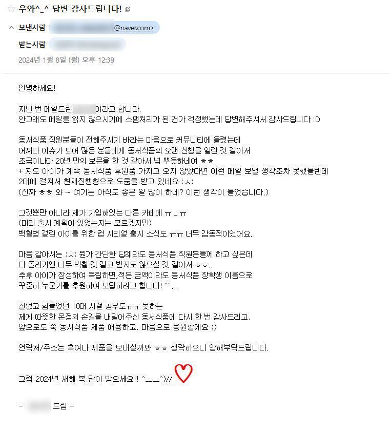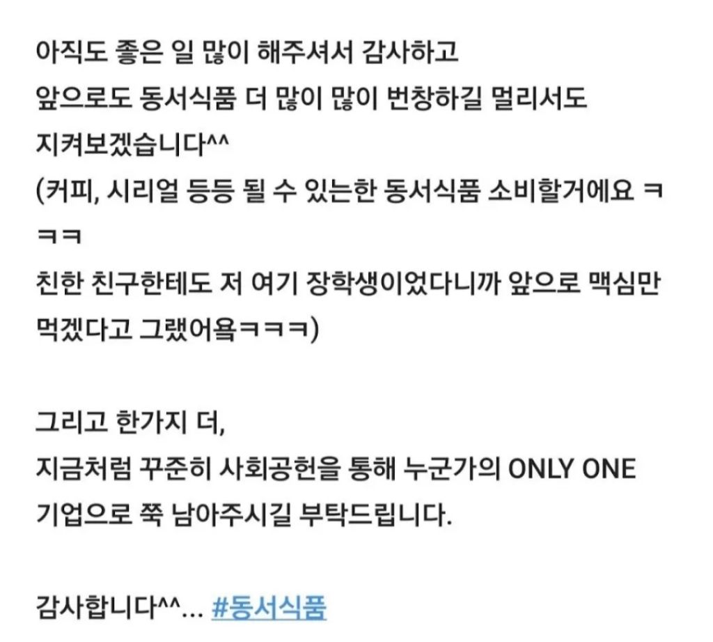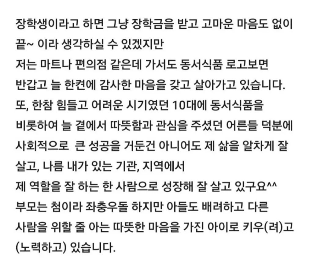 [스크랩] [흥미돋]20년 전에 나 장학금 준 동서식품에 메일보냈다 ㅎㅎㅎ 작성자Tory-|작성시간26.02.10|조회수19,425 목록 댓글 49 글자크기 작게가 글자크기 크게가 출처: https://x.com/i/status/1998969149226365266++동서식품 회신메일 추가 다음검색 스크랩 원문 : *여성시대* 차분한 20대들의 알흠다운 공간 현재 게시글 추가 기능 열기 북마크 공유하기 신고 센터로 신고 댓글 댓글 49 댓글쓰기 답글쓰기 댓글 리스트 작성자나이제사랑믿어 | 작성시간 26.02.11 감동이다ㅠㅠ 앞으로 동서식품 보면 이 글 생각날듯 ㅠㅠㅠㅠ 뭐라도 사먹을거야ㅠㅠ 작성자부산강쥐 | 작성시간 26.02.11 작성자버려진 섬마다 꽃은 피었다 | 작성시간 26.02.11 감덩이네 작성자파란색88 | 작성시간 26.02.11 돈쭐각 작성자돈많은백수가꿈이에요 | 작성시간 26.02.11 비상 비상 ㅠㅠ 동서식품만 사야지 댓글 전체보기
