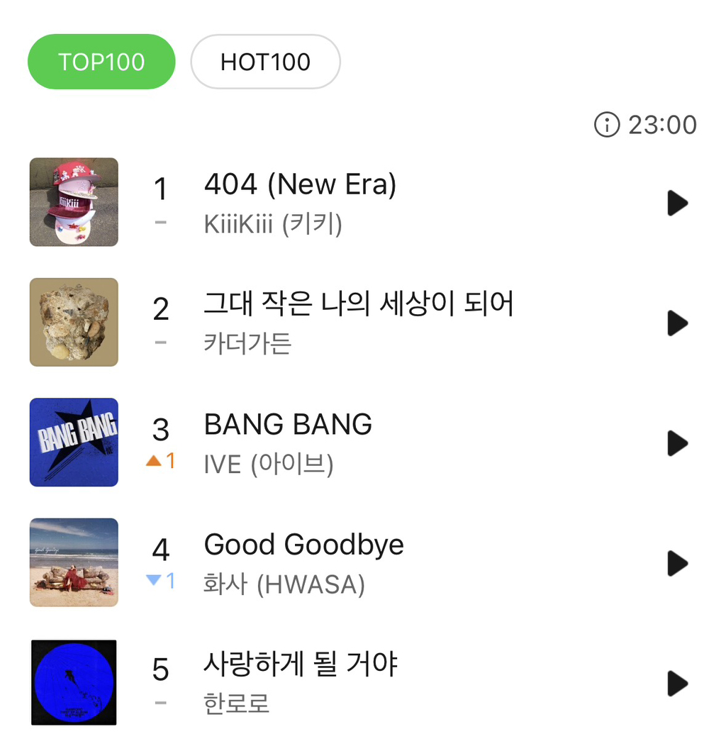 [흥미돋]KiiiKiii 키키 ‘404 (New Era)’ 멜론 탑백 1위 작성자타겟|작성시간26.02.10|조회수7,321 목록 댓글 68 글자크기 작게가 글자크기 크게가 출처: https://theqoo.net/square/40907078122026년 발매곡 중 첫 1위 곡https://youtu.be/zhHB4dZTChw 다음검색 현재 게시글 추가 기능 열기 북마크 공유하기 신고 센터로 신고 댓글 댓글 68 댓글쓰기 답글쓰기 댓글 리스트 작성자너무해진짜 | 작성시간 26.02.11 개좋더라 작성자Thank | 작성시간 26.02.11 뉴에롸에롸~ 작성자오대오먹꼬 | 작성시간 26.02.11 뉴에라에라 작성자변화의 바람 | 작성시간 26.02.12 좌표밖의 지점 작성자태인라이온즈 | 작성시간 26.02.13 노래ㅠ넘조아 빠짐.. 댓글 전체보기