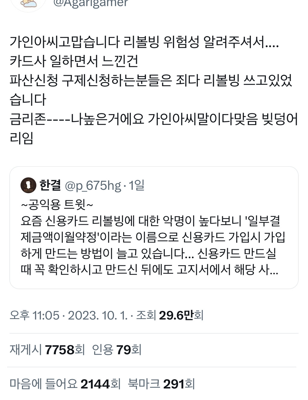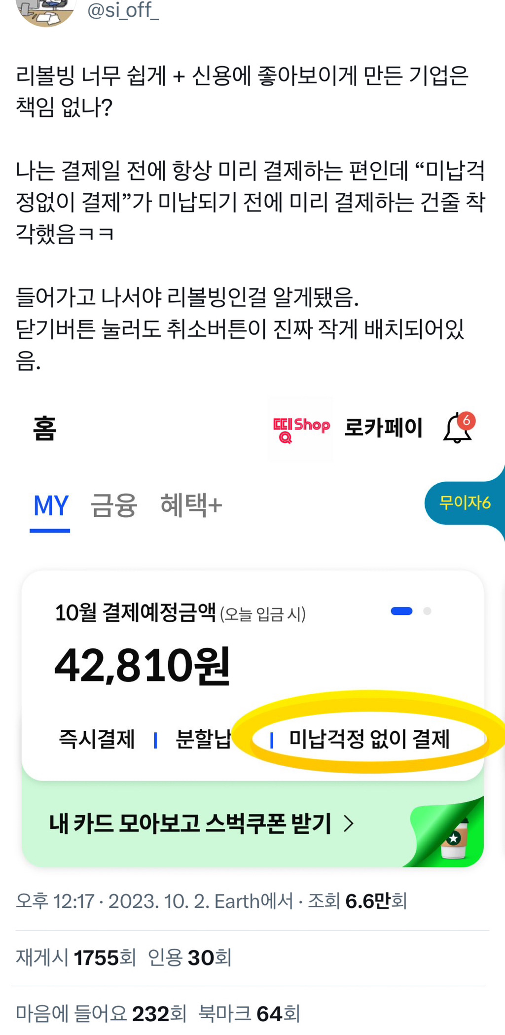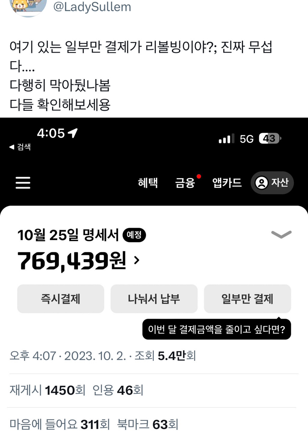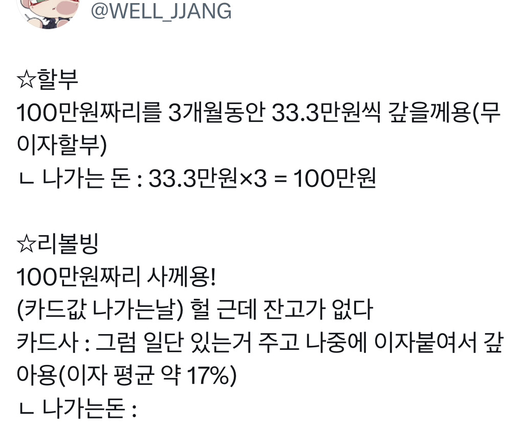 리볼빙 아니냐니까 아니라던데 짱나서 끊었었음 ㅠㅠ 아니 리볼빙 맞으면서 왜 아니라고 구라까지 쳐 -