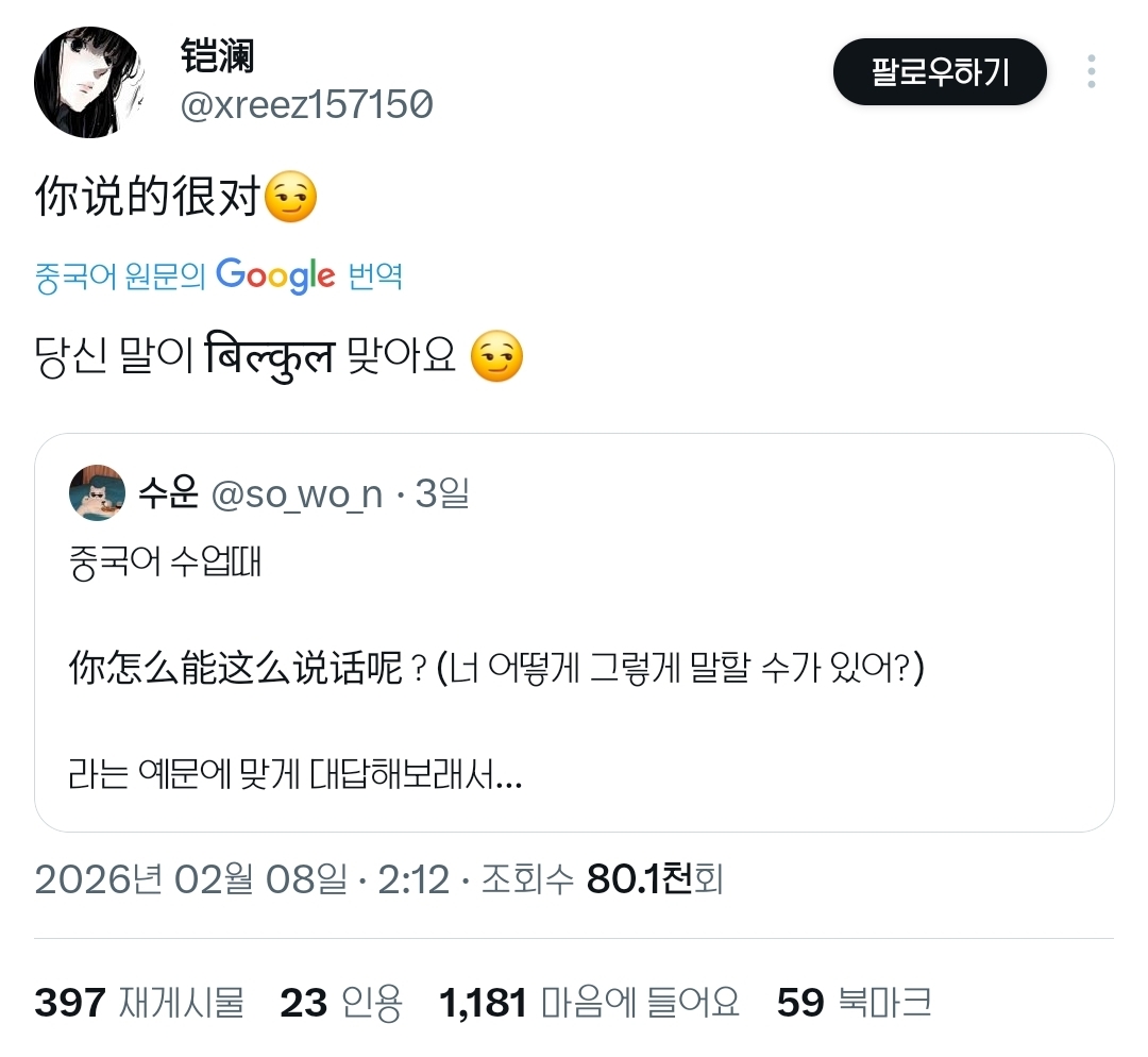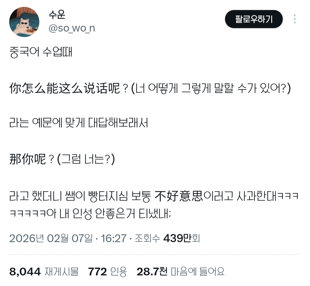 [배꼽의행방]중국어 수업하다가 인성 들킨 썰.twt 작성자카이지|작성시간26.02.11|조회수60,902 목록 댓글 42 글자크기 작게가 글자크기 크게가 출처: https://x.com/i/status/2020036770348556331https://x.com/i/status/2020036770348556331不好意思(뿌하오이쓰)=미안해https://x.com/i/status/2020183963160183146 다음검색 현재 게시글 추가 기능 열기 북마크 공유하기 신고 센터로 신고 댓글 댓글 42 댓글쓰기 답글쓰기 댓글 리스트 작성자앙버터소금빵 | 작성시간 26.02.11 학생 답변이 더 현지인스러운걸 작성자곧백수 | 작성시간 26.02.11 존나웃김 작성자짱워녕 | 작성시간 26.02.11 ㅋㅌㅋㅋㅋㅋ 작성자브치숲 | 작성시간 26.02.11 ㅋㅋㅋㅋㅋㅋㅋㅋㅋㅋㅋㅋㅋㅋㅋ 나 니너 ? ㅋㅋㅋㅋㅋㅋㅋㅋ 개웃기넼ㅋㅋㅋㅋㅋ 작성자겨울러버 | 작성시간 26.02.11 니 쉬 션머;; 댓글 전체보기
