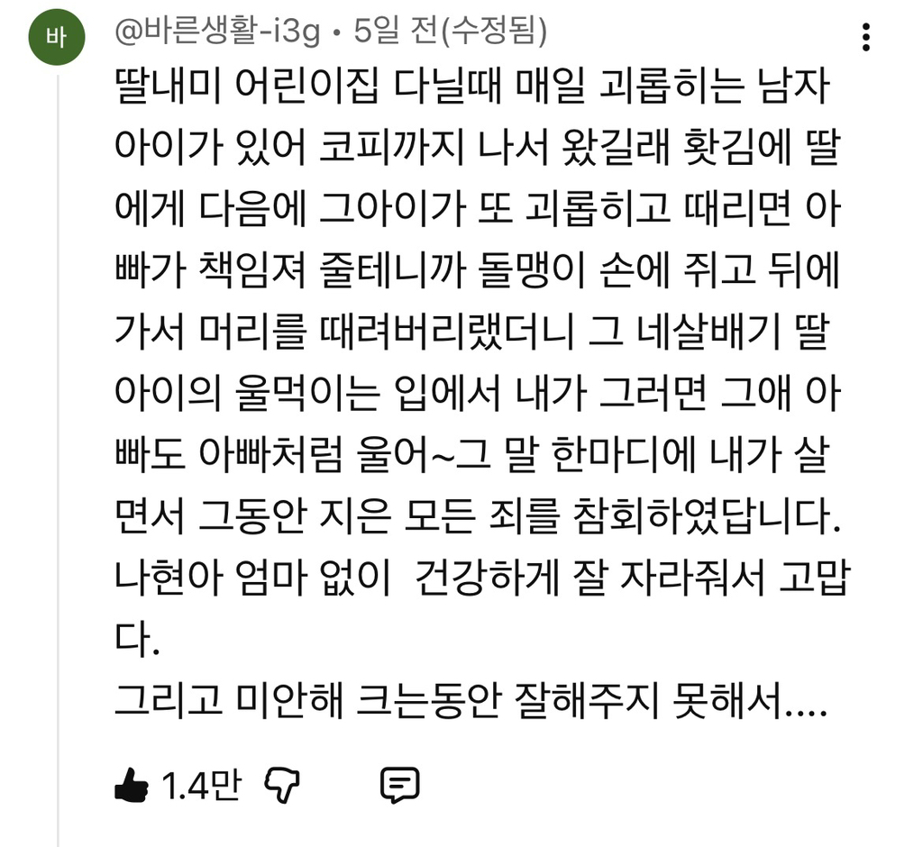 답댓글 작성자별이있는그대 작성시간 26.02.22 나 초딩때부터도 위험한순간이면, 옆에 짱돌을 쥐어다 머리를 치던가, 손가락으로 눈이라도 찌르라고. 아빠가 대신 깜방들어간다고해줌.