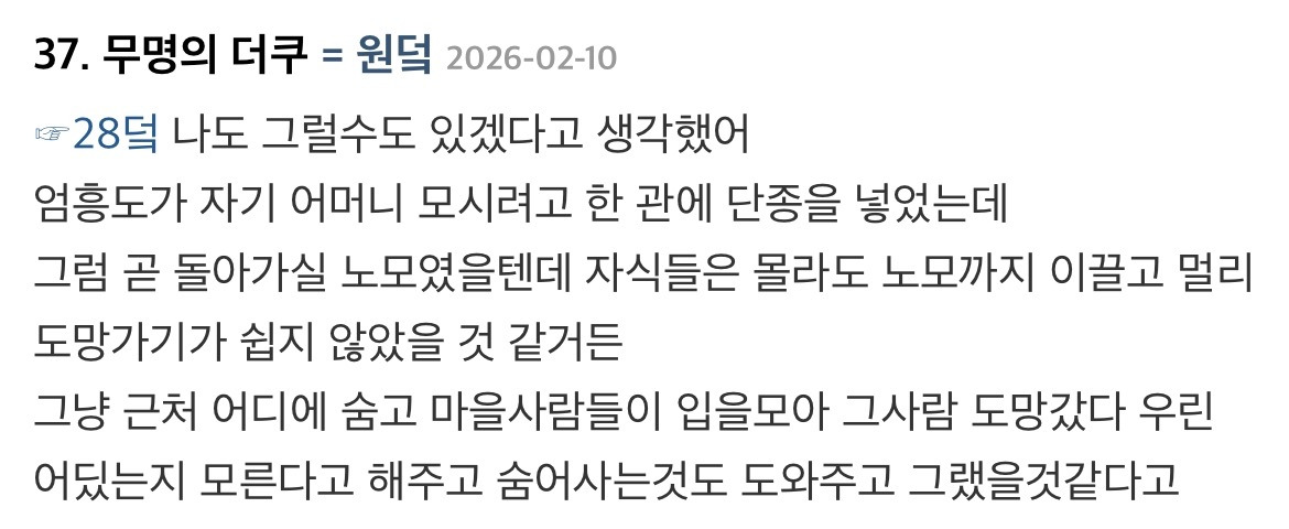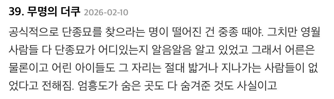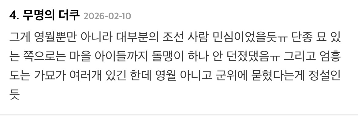 [흥미돋]왕사남) 실제 역사 찾아보니까 진짜 영월사람들이 단종을 엄청 아꼈던 것 같더라.jpg 작성자Egypt|작성시간26.02.11|조회수114,099 목록 댓글 215 글자크기 작게가 글자크기 크게가 출처: https://theqoo.net/movie/4090126373 ㅁㅂ 다음검색 현재 게시글 추가 기능 열기 북마크 공유하기 신고 센터로 신고 댓글 댓글 215 댓글쓰기 답글쓰기 댓글 리스트 작성자니익네에이임 | 작성시간 26.02.16 우와... 작성자경제적자유를이뤘다 | 작성시간 26.02.17 아 진짜 찾아볼수록 현실이 더 잔인했어서 마음이 아픔 ㅠㅠㅠㅠ 작성자muse는무세 | 작성시간 26.02.17 ㅅㅂㅌㅋㅋㅋㅋㅋ 몰래 돌 던졌댘ㅋㅋㅋㅋㅋ 작성자해태고향만두 | 작성시간 26.02.17 하 또 슬퍼ㅠㅠㅠㅠㅠ 안타까운 역사... 작성자뜡치기박치기 | 작성시간 26.03.19 수양 이씨밸롬 댓글 전체보기