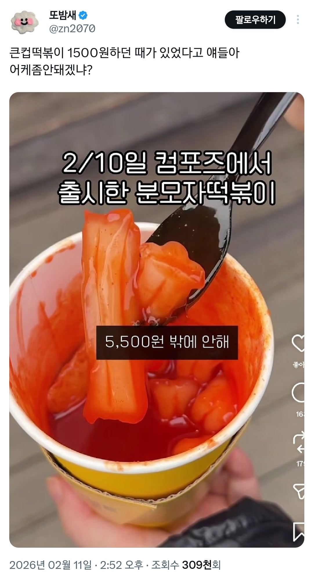 [흥미돋]컴포즈 분모자 컵떡볶이 5500원 샤갈 말세다.twt 작성자스피또띠아|작성시간26.02.11|조회수19,250 목록 댓글 63 글자크기 작게가 글자크기 크게가 출처: https://x.com/i/status/2021468589619085461 여성시대 스피또띠아 다음검색 현재 게시글 추가 기능 열기 북마크 공유하기 신고 센터로 신고 댓글 댓글 63 댓글쓰기 답글쓰기 댓글 리스트 작성자엥 제가요? | 작성시간 26.02.11 떡볶이는 자고로 최저임금(시급)의 1/10이 적당하다고남녀노소 모두가 부담없이 즐겨야 하는 포지션이라고 작성자Aura | 작성시간 26.02.11 너무비싼ㄷ 작성자뮹용 | 작성시간 26.02.12 500원 작성자하츠투하츠 | 작성시간 26.02.12 큰컵에 튀김200원치랑 떡볶이300원치범벅해서 500원치로 달라하면 존맛 작성자행복한여시시 | 작성시간 26.02.12 콤보할인해서 먹지 아니면 안먹을듯 댓글 전체보기