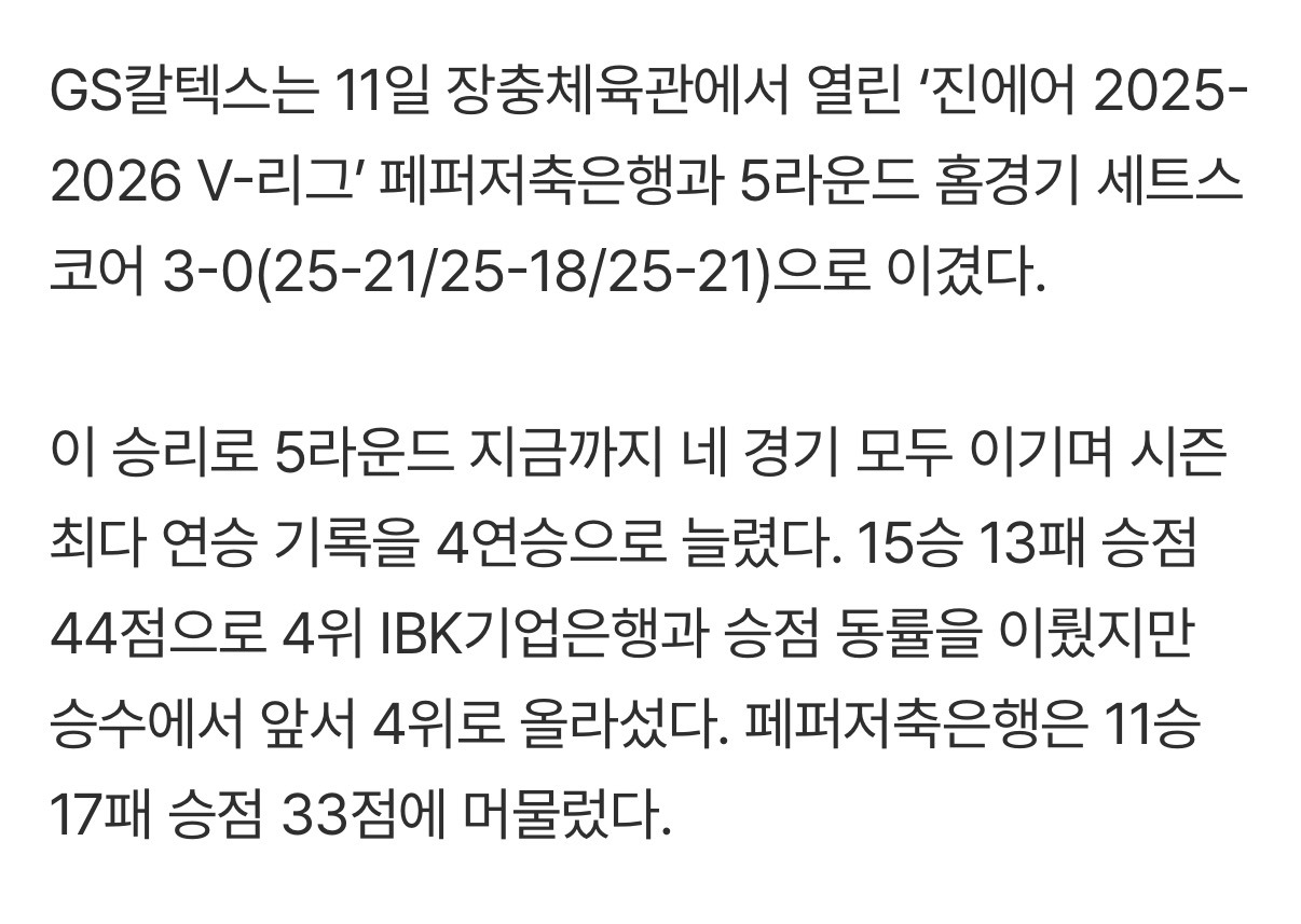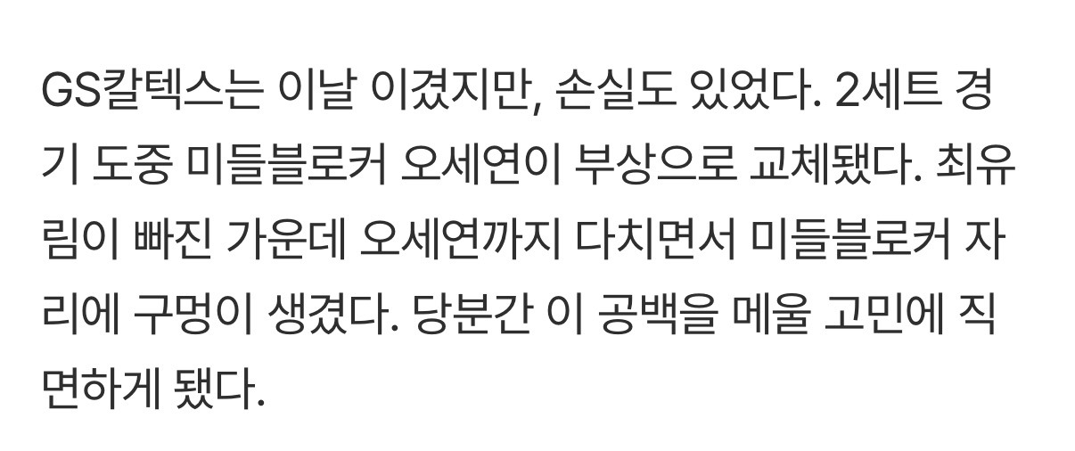 [여시뉴스데스크]‘서브 대폭발’ GS, 페퍼 잡고 4연승 질주했지만...MB 오세연 부상 이탈 [MK현장] 작성자슈퍼펭귄시리얼|작성시간26.02.11|조회수2,128 목록 댓글 1 글자크기 작게가 글자크기 크게가 출처: https://m.sports.naver.com/volleyball/article/410/0001112009‘서브 대폭발’ GS, 페퍼 잡고 4연승 질주했지만...MB 오세연 부상 이탈 [MK현장]여기를 눌러 링크를 확인하세요m.sports.naver.com 다음검색 현재 게시글 추가 기능 열기 북마크 공유하기 신고 센터로 신고 댓글 댓글 1 댓글쓰기 답글쓰기 댓글 리스트 작성자요가처돌이 | 작성시간 26.02.11 오세바리 아무 이상 없길 ㅠㅠ 댓글 전체보기