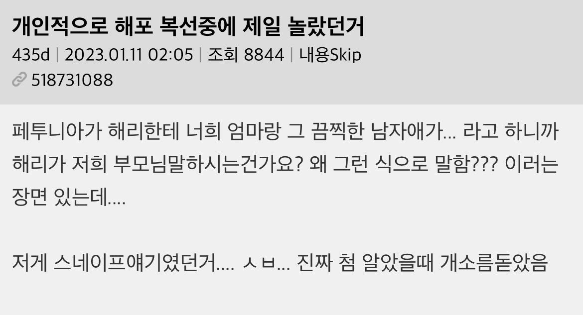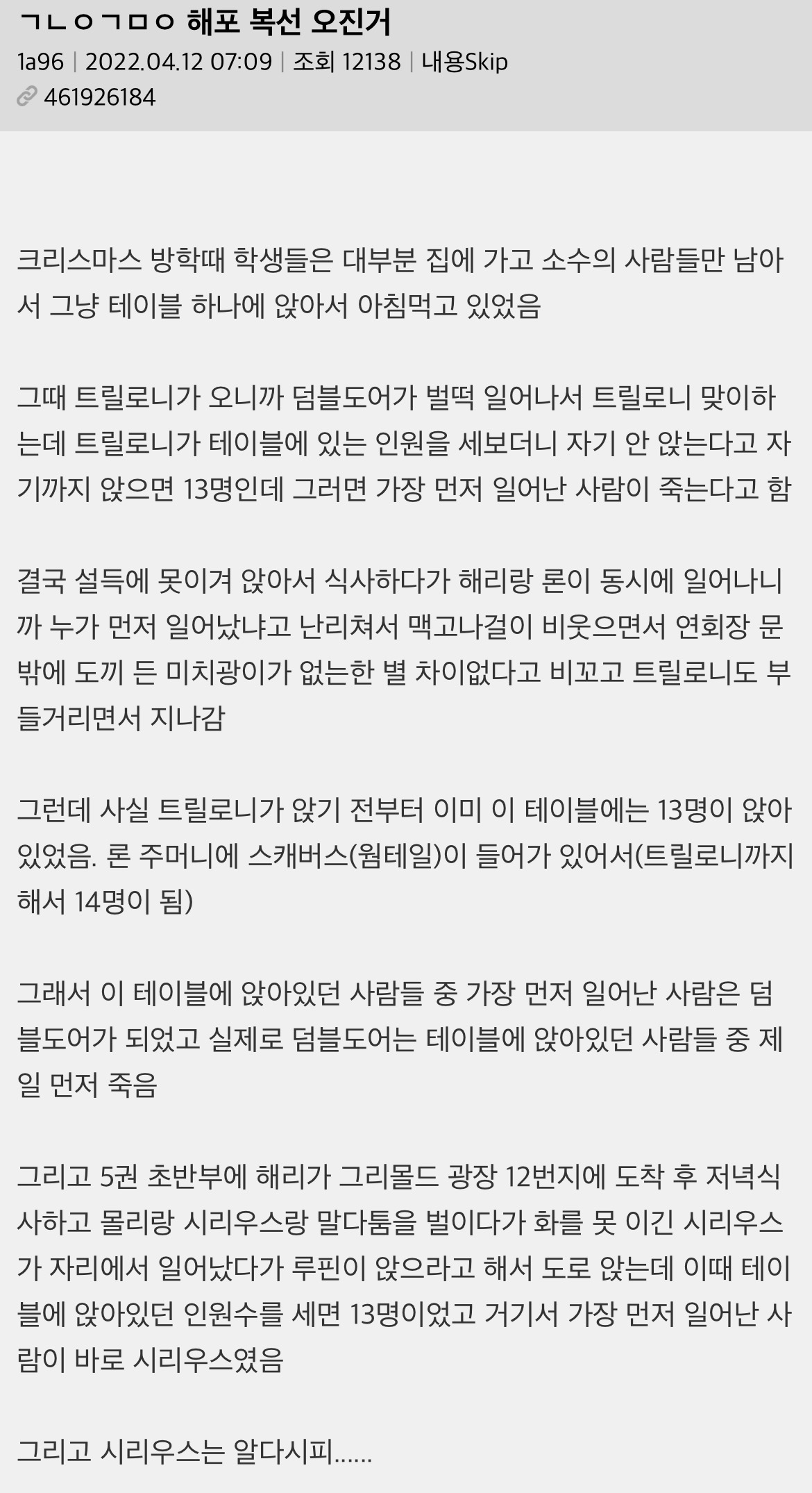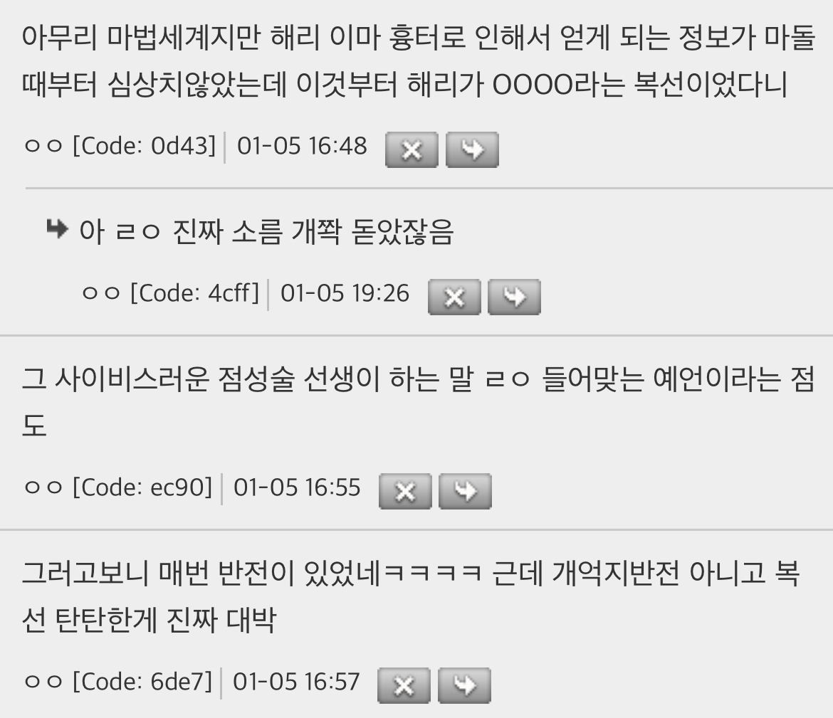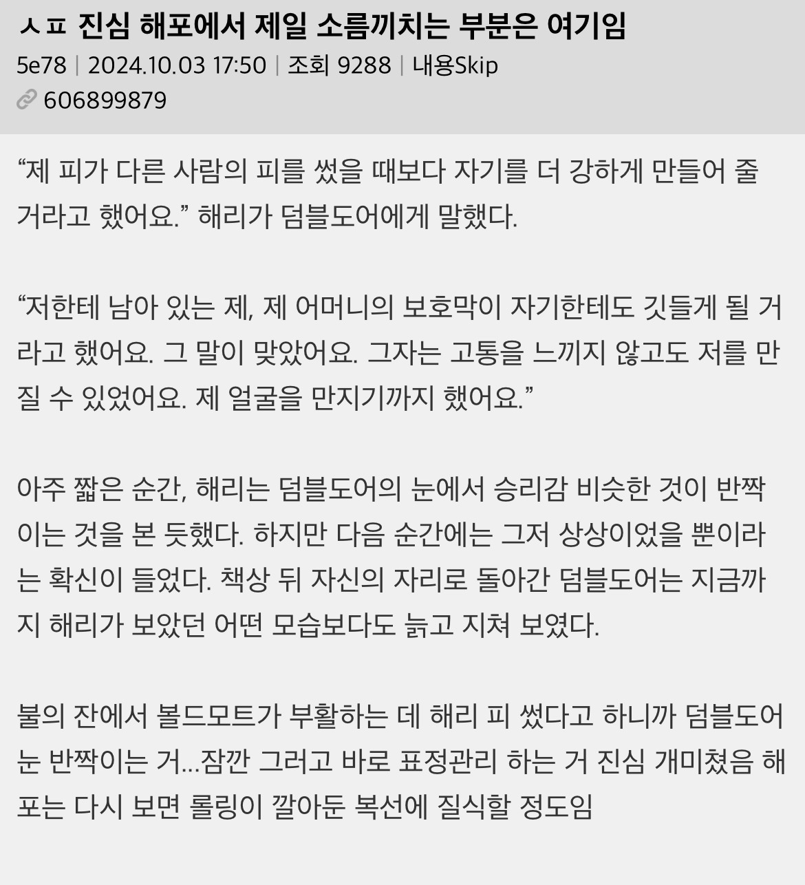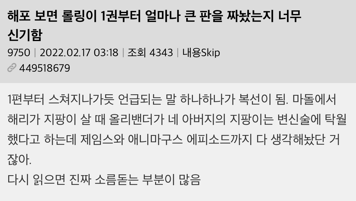 작성자토토로 작성시간 26.02.12 작년에 해포 책 정주행 했는데 진짜 다 알고 보면 떡밥 지리더라 제임스 지팡이 변신술은 못 알아차렸는데 하나 더 알고 간다.. 지린다 진짜