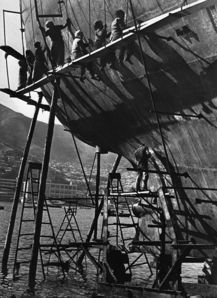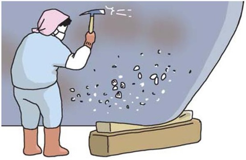 선박에 붙은 따개비들을 직접 망치로 쳐서 떼내는 일