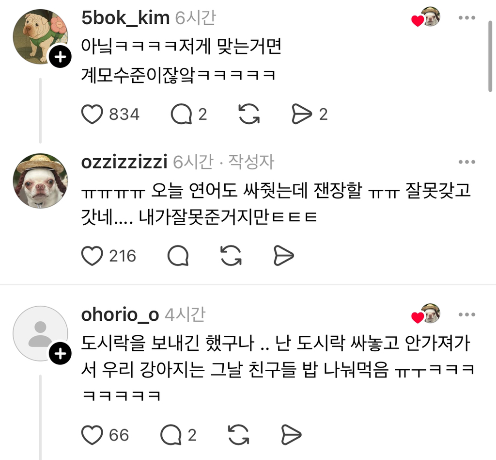 [스크랩] [흥미돋]우리 강아지 유치원 도시락 잘못가져갔어.. 작성자순방대회|작성시간26.02.12|조회수66,134 목록 댓글 45 글자크기 작게가 글자크기 크게가 출처: https://www.threads.com/@ozzizzizzi/post/DMovz5PJDWF 다음검색 스크랩 원문 : *여성시대* 차분한 20대들의 알흠다운 공간 현재 게시글 추가 기능 열기 북마크 공유하기 신고 센터로 신고 댓글 댓글 45 댓글쓰기 답글쓰기 댓글 리스트 작성자전지현 | 작성시간 26.02.12 귀여워 미치겠다 작성자peeta mellark | 작성시간 26.02.12 잘못보냇어요.. 작성자하리보콜라 | 작성시간 26.02.12 프라이드킴ㅋㅋㅋㅋㅋ 작성자인피쉰 | 작성시간 26.02.12 아아악 귀여워ㅠㅠㅠ다른 강쥐들 도시락 같이 나눠먹을거 상상하니까 더 귀여와ㅠㅠ오쪼쪼.... 작성자3연타 | 작성시간 26.02.12 백프로 갈색푸들이다 댓글 전체보기