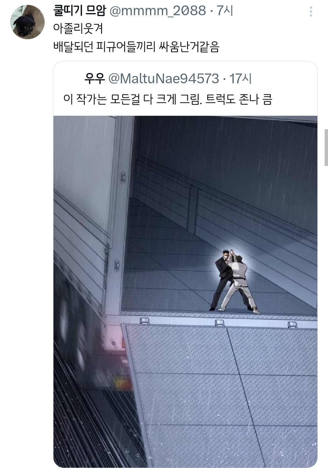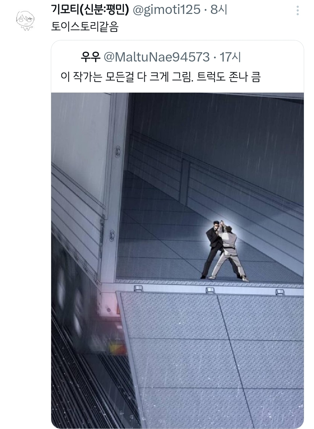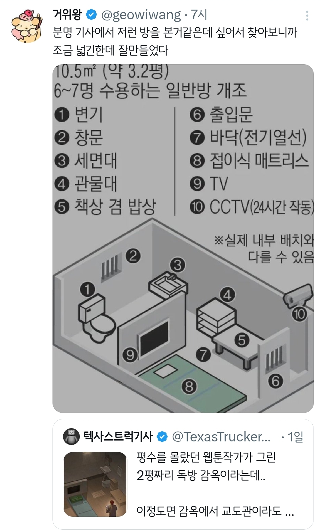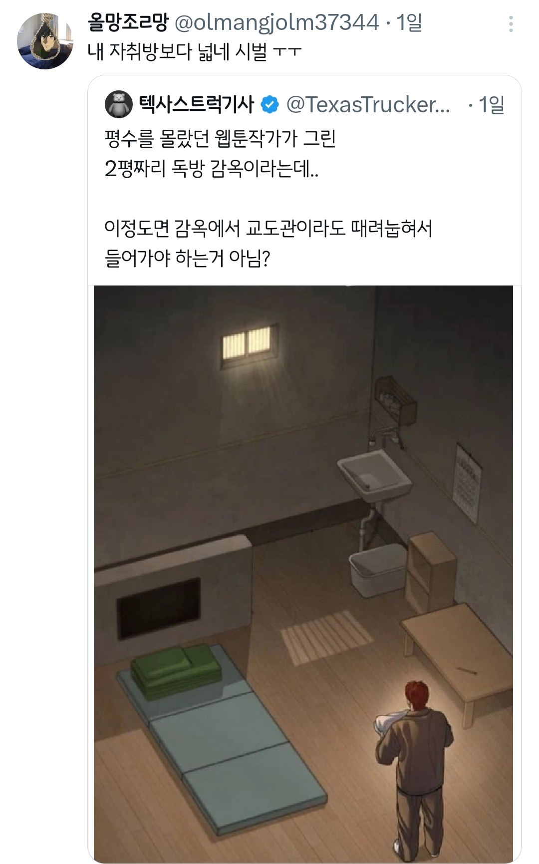 [흥미돋]웹툰 속 2평짜리 교도소 독방.twt 작성자치킨바냐나|작성시간26.02.12|조회수34,000 목록 댓글 85 글자크기 작게가 글자크기 크게가 출처: 여성시대 치킨바냐나https://x.com/i/status/2021217137025491062X의 텍사스트럭기사님(@TexasTrucker30)평수를 몰랐던 웹툰작가가 그린 2평짜리 독방 감옥이라는데.. 이정도면 감옥에서 교도관이라도 때려눕혀서 들어가야 하는거 아님?x.com샤갈ㅋㅋㅋㅋㅋㅋㅋ 다음검색 현재 게시글 추가 기능 열기 북마크 공유하기 신고 센터로 신고 댓글 댓글 85 댓글쓰기 답글쓰기 댓글 리스트 작성자-2kg | 작성시간 26.02.12 트럭 ㅅㅂ 너무하잖아 ㅋㅋㅋㅋㅋㅋㅋ 작성자수 지 | 작성시간 26.02.12 아 트럭ㅋㅋㅋㅋㅋㅋㅋㅋㅋㅋㅋㅋㅋㅋㅋㅋ 작성자신의성실의 원칙 | 작성시간 26.02.12 토이스토리아녀? 작성자악운에강한여시 | 작성시간 26.02.13 개웃기네ㅋㅋㅋ 작성자낮말은새가듣고반말하면뒤져 | 작성시간 26.02.19 피규어였구나... 난 또 교도소가 넓은줄 알았지 댓글 전체보기
