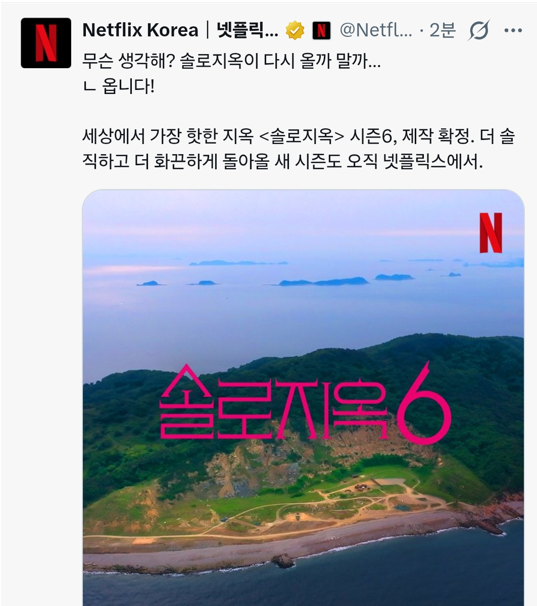 [흥미돋]<솔로지옥> 시즌6, 제작 확정 작성자wtua|작성시간26.02.12|조회수19,415 목록 댓글 39 글자크기 작게가 글자크기 크게가 출처: https://x.com/NetflixKR/status/2021751105475015160?s=20 다음검색 현재 게시글 추가 기능 열기 북마크 공유하기 신고 센터로 신고 댓글 댓글 39 댓글쓰기 답글쓰기 댓글 리스트 작성자럭키비키재석 | 작성시간 26.02.12 그 이번에 뉴욕 퀀트 트레이더처럼 신선한 직업 오면 좋겠음 경사말고 작성자성선설의마지막희망 | 작성시간 26.02.12 이제 포스트 미나수들 많이 나오겟네... 작성자월화술먹구토 | 작성시간 26.02.12 올스타전 하자 미나수 덱수 하정 이관희 프링이 작성자뉴치케아봉 | 작성시간 26.02.12 솔지 3보고 안봤는데 봐야겠닼ㅋㅋㅋㅋ 작성자복세편살희망자 | 작성시간 26.02.13 난 너네만본단다 존잼솔지야 기대할게 댓글 전체보기