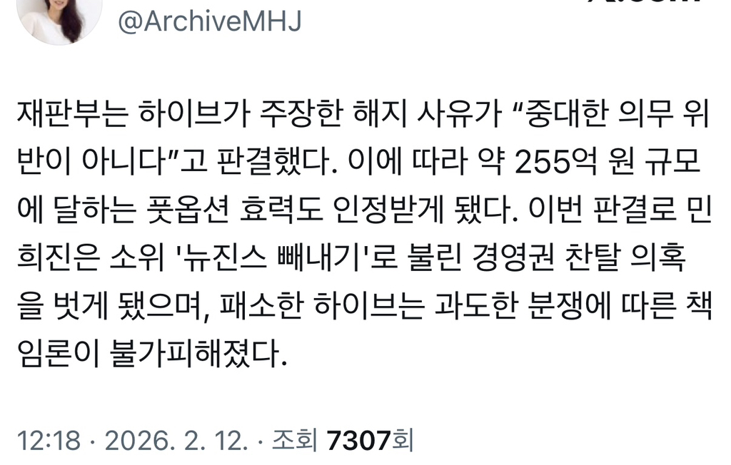 [흥미돋]민희진-하이브 판결문 요약 작성자탅젤리제|작성시간26.02.12|조회수43,000 목록 댓글 390 글자크기 작게가 글자크기 크게가 출처: https://x.com/archivemhj/status/2021781131667063268?s=46https://x.com/archivemhj/status/2021784139754848382?s=46그렇다고 하네 다음검색 현재 게시글 추가 기능 열기 북마크 공유하기 신고 센터로 신고 댓글 댓글 390 댓글쓰기 답글쓰기 댓글 리스트 작성자늴리리야늴리리야 | 작성시간 26.02.13 방시혁뷘들 다 어디감 작성자검뱃70 | 작성시간 26.02.13 크 ㅊㅊㅊㅊ ㅠㅠ 추이브 개꼬시다 작성자망원동여시 | 작성시간 26.02.13 하붕이 갸샥기들아ㅜ 작성자미냐오 | 작성시간 26.02.14 짇짜싯팔 하붕이들이랑 맞서 싸우던때 생각나서 서럽네 민 뉴진스 화이팅 작성자귀뚜라미귀뚜라미 | 작성시간 26.02.14 고생했네 댓글 전체보기