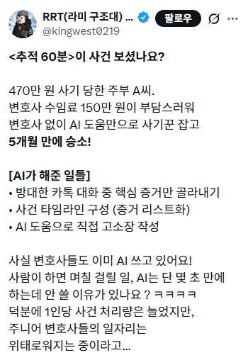작성자easy does it 작성시간 26.02.12 소액재판은 원래도 개인들이 나혼자소송 전자소송으로 혼자 많이 하지않았어? ai 도움받으면 확실히 더 쉽게 할 듯