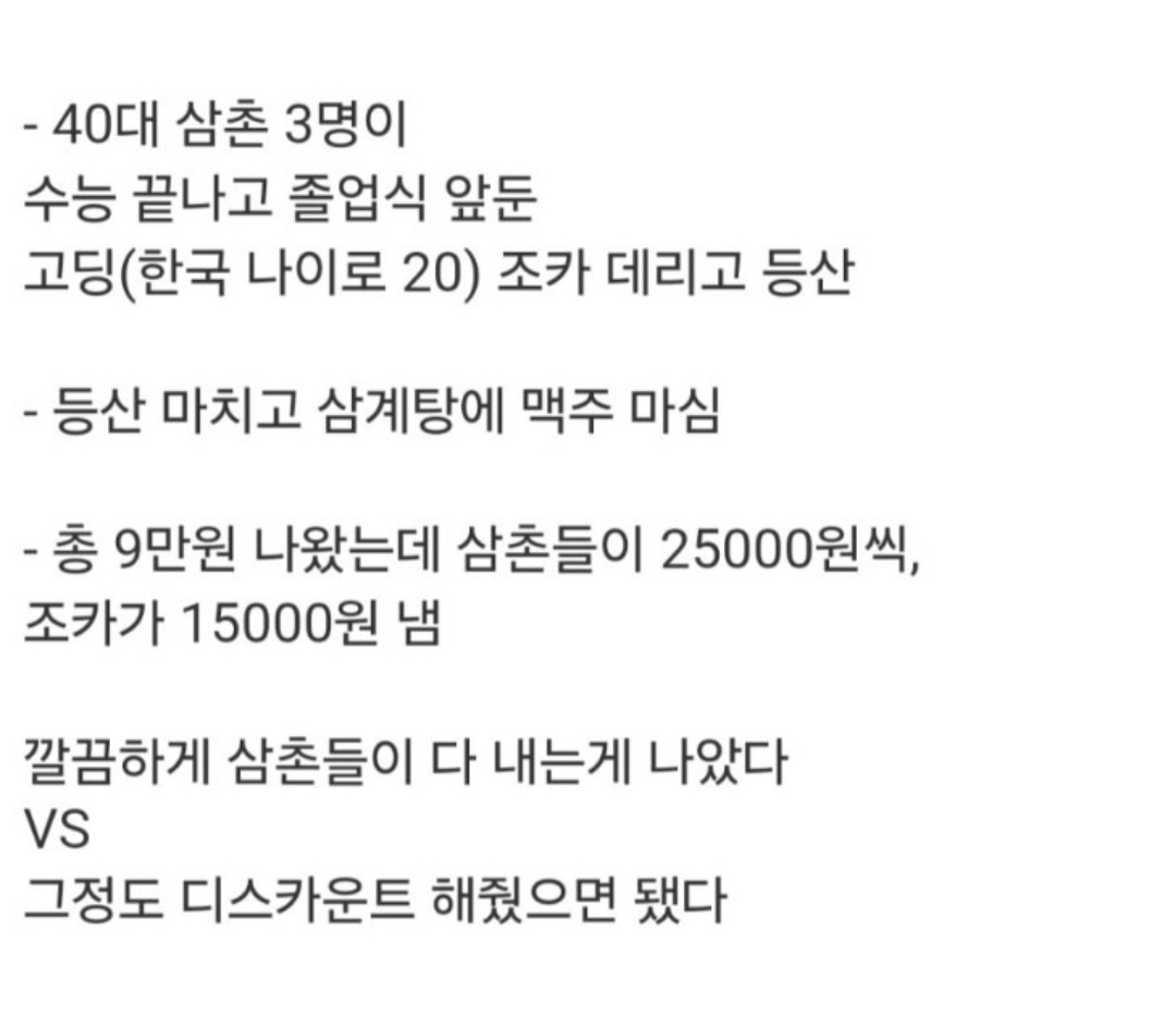 [흥미돋]조카랑 등산 마치고 더치페이한 삼촌들 ㅋㅋ 작성자계절 틈에 잠시 피는 낯선꽃처럼|작성시간26.02.12|조회수40,791 목록 댓글 214 글자크기 작게가 글자크기 크게가 출처: https://m.cafe.daum.net/subdued20club/ReHf/5402148?svc=cafeapp 다음검색 현재 게시글 추가 기능 열기 북마크 공유하기 신고 센터로 신고 댓글 댓글 214 댓글쓰기 답글쓰기 댓글 리스트 작성자이용민아닌가요 | 작성시간 26.02.13 솔직히 매 주 만나면 뿜빠이 인정인데 한 번 만나는데 뿜빠이 에휴.. 작성자감자부침개 | 작성시간 26.02.13 내가 내지 당연히... 작성자딥치즈 베이컨 포테이토 | 작성시간 26.02.13 한남들이란ㅉㅉ 작성자김치값때문에김밥에김치가실종 | 작성시간 26.02.14 마지막잘목튜표함 작성자닉넴바꿀떼가됏다 | 작성시간 26.02.16 실화 아니지??? 댓글 전체보기