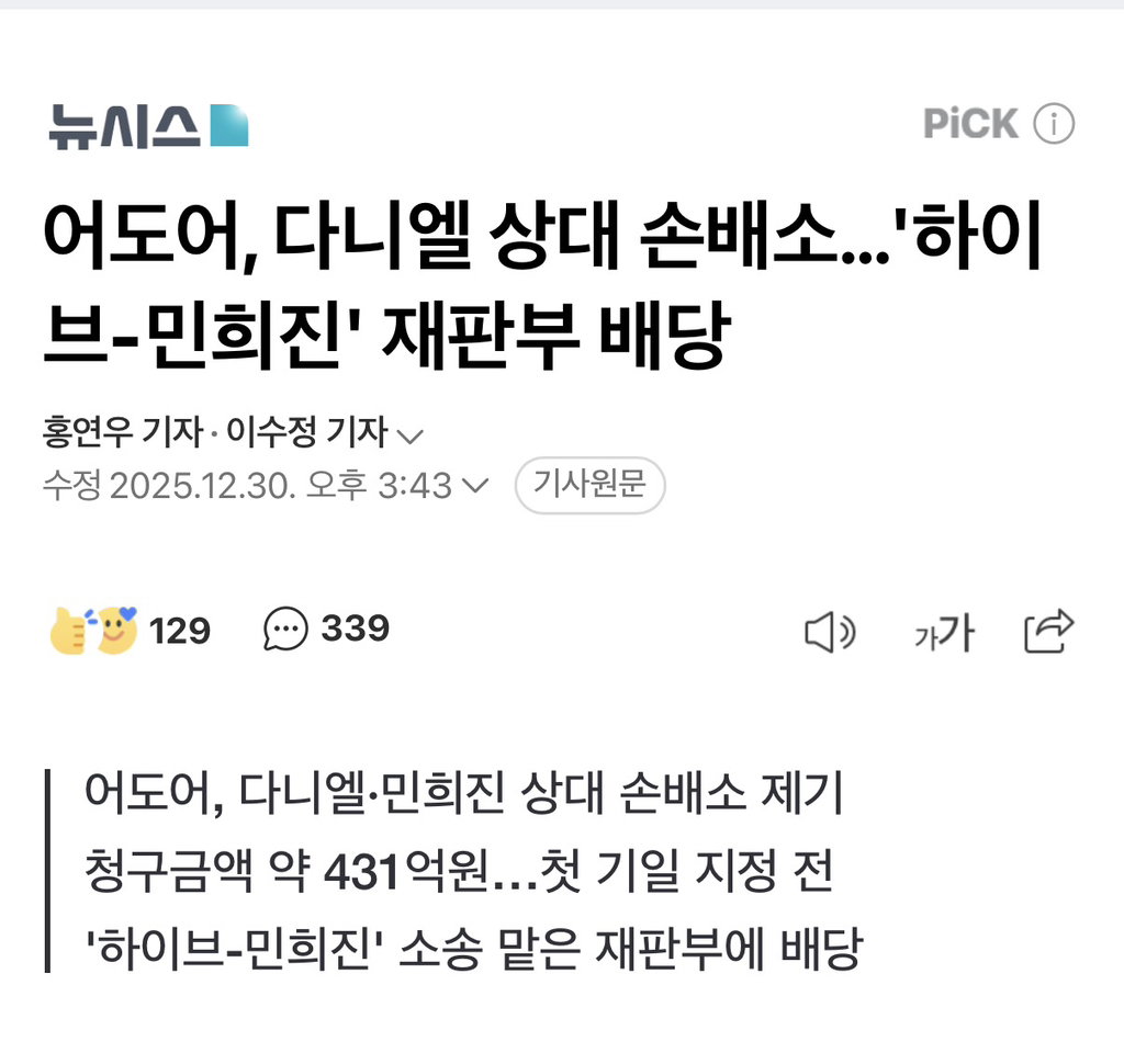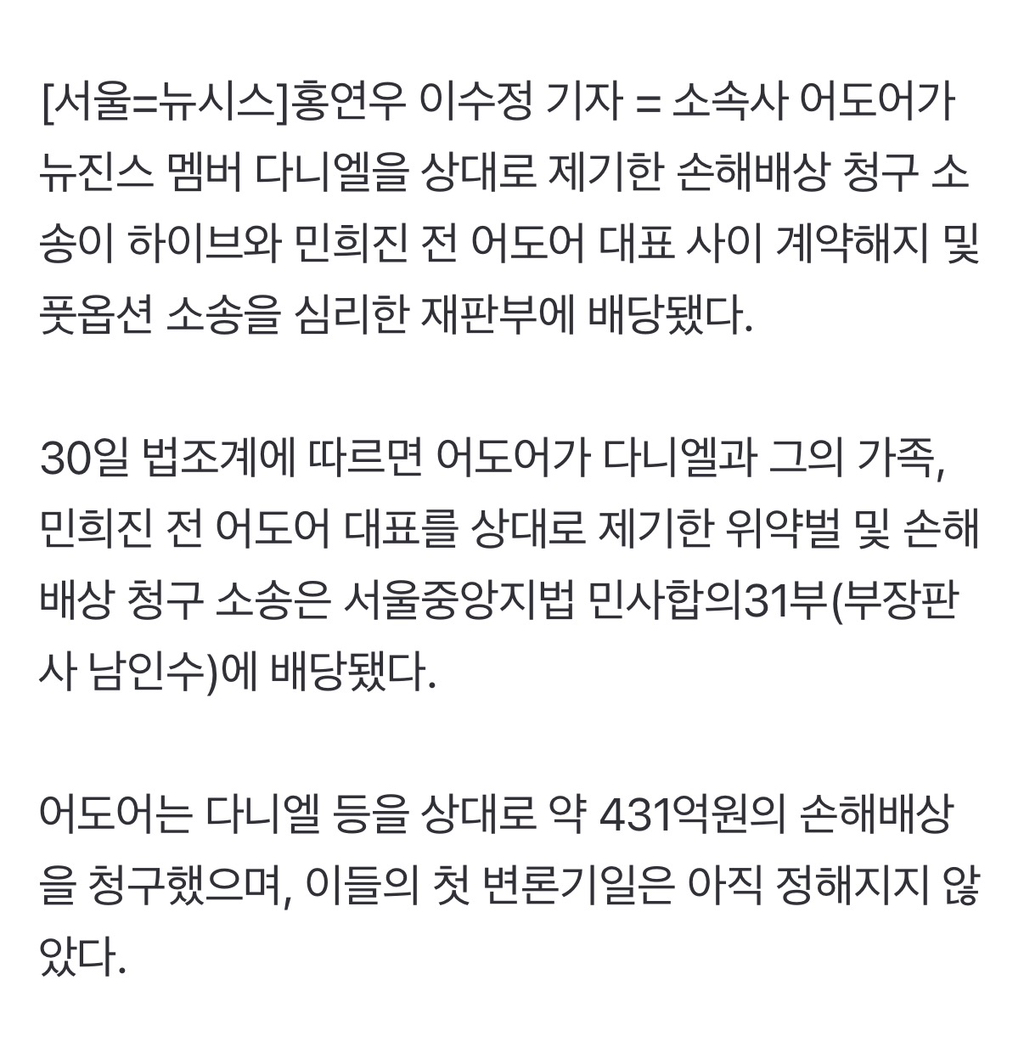 참고로 배당 된 재판부는 하이브-민희진 주주간계약 재판에서 민희진이 승소한 재판부와 같음