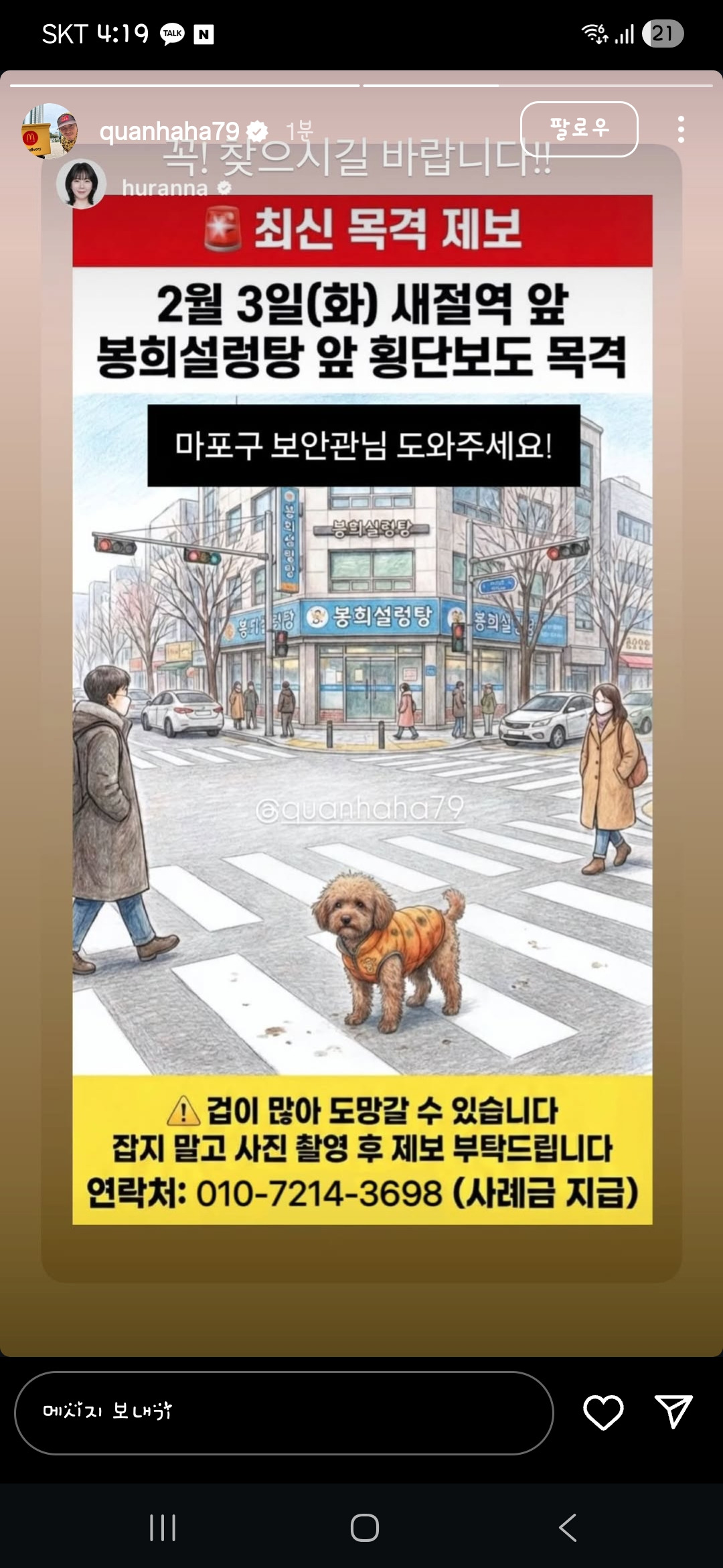 혹시나 응암역, 새절역, 북가좌동, 홍제동 일대에 사는 여시 중, 복동이를 본 여시가 있다면 제보 부탁할게 ㅠㅠ!!