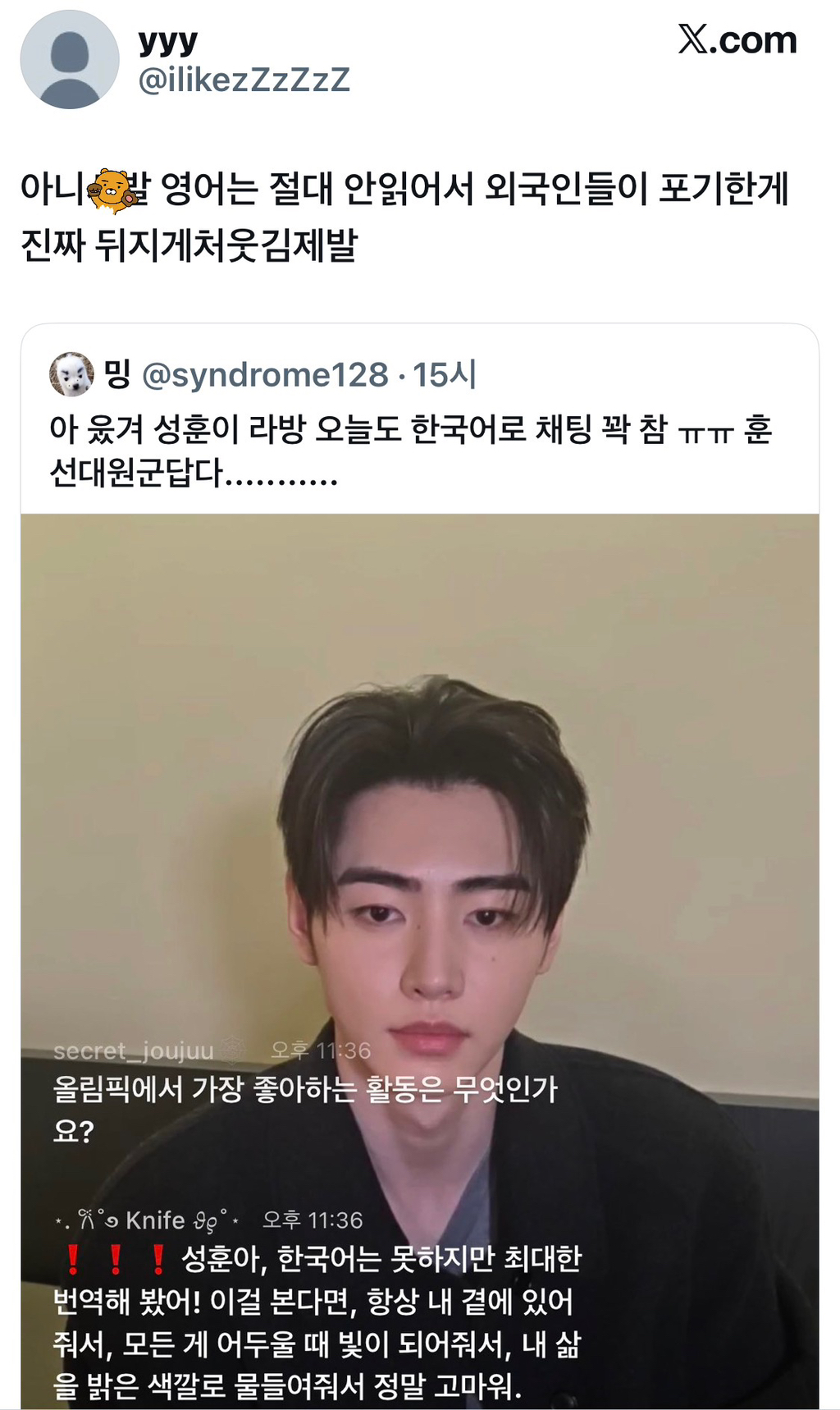 작성자나이트윙 작성시간 26.02.13 아니 근데 한글로도 지네 나라 말해달라고 하는거 진짜 지독하넼ㅋㅋㅋㅋㅋㅋㅋㅋㅋㅋㅋㅋㅋㅋㅋㅋㅋㅋㅋㅋ