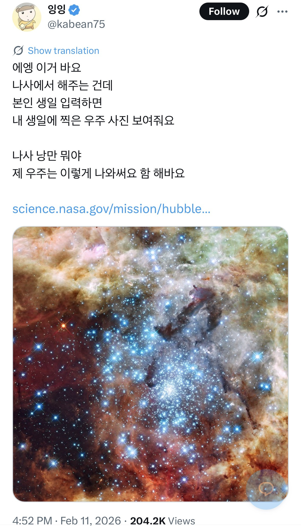[흥미돋]나사에서 해주는 건데 본인 생일 입력하면 내 생일에 찍은 우주 사진 보여줘요 작성자Sunmoonstar02|작성시간26.02.13|조회수8,577 목록 댓글 88 글자크기 작게가 글자크기 크게가 출처: https://x.com/kabean75/status/2021749297033982170?s=20링크https://science.nasa.gov/mission/hubble/multimedia/what-did-hubble-see-on-your-birthday/ 다음검색 현재 게시글 추가 기능 열기 북마크 공유하기 신고 센터로 신고 댓글 댓글 88 댓글쓰기 답글쓰기 댓글 리스트 작성자락나카 | 작성시간 26.02.13 묘하다 뭔가 외로운 느낌들어 이미지 확대 작성자강된장보리비빔밥 | 작성시간 26.02.13 이미지 확대 작성자부끄럽지않아 | 작성시간 26.02.13 이미지 확대 작성자아이건참지 | 작성시간 26.02.14 이미지 확대 작성자염두리와는 인연이 깊어요 | 작성시간 26.02.15 이미지 확대 댓글 전체보기