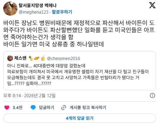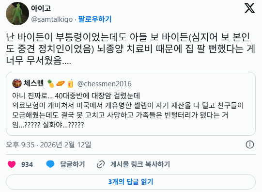 작성자익명,,,,, 작성시간 26.02.13 그럼 미국은 평균수명이 엄청 낮나..?? 늙으면 거의 병걸리는데..