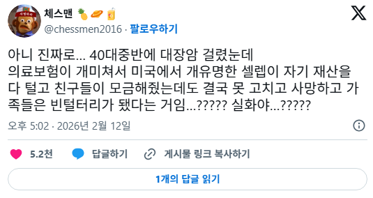 작성자배고프면백두산 작성시간 26.02.13 우리나라 건강보험 진짜 만세 만만세야... 특히 집에 아픈 사람 있어봐.... 건보료 매달 내는거 아주 감사하면서 절하면서 낸다.... 건보 아니었으면 진짜로 돈없어서 치료 못받고 죽는사람 너무 많을듯