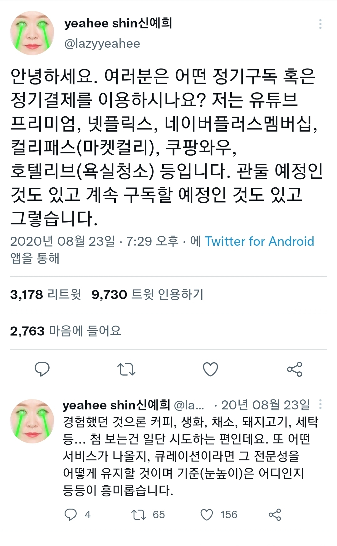 [스크랩] [흥미돋]정기구독 이용하는 것 말해보기 작성자약산성폼클|작성시간26.02.13|조회수1,747 목록 댓글 51 글자크기 작게가 글자크기 크게가 출처 : 여성시대 문어캔두애니띵https://twitter.com/lazyyeahee/status/1297480992383307778?s=19yeahee shin신예희 on Twitter“안녕하세요. 여러분은 어떤 정기구독 혹은 정기결제를 이용하시나요? 저는 유튜브 프리미엄, 넷플릭스, 네이버플러스멤버십, 컬리패스(마켓컬리), 쿠팡와우, 호텔리브(욕실청소) 등입니다. 관twitter.com넷플릭스벅스+웨이브 결합네이버플러스쿠팡와우티빙 다음검색 스크랩 원문 : *여성시대* 차분한 20대들의 알흠다운 공간 현재 게시글 추가 기능 열기 북마크 공유하기 신고 센터로 신고 댓글 댓글 51 댓글쓰기 답글쓰기 댓글 리스트 작성자엣프제여시 | 작성시간 26.02.13 네이버(넷플) 티빙 쿠팡 어도비 작성자오마위아래 | 작성시간 26.02.13 유튜브 네멤(넷플) 마이박스 작성자니가몰알아hh | 작성시간 26.02.13 밀리의서재네이버멤버쉽 작성자스마부미 | 작성시간 26.02.13 넷플, 디플 4인팟, 유튭 인도, 쿠팡, 티빙+배민나름 가성비로 구독하려고 노력중 작성자졸리면 자자 | 작성시간 26.02.20 네이버 플러스 : 조만간 해지 예정유튜브 댓글 전체보기