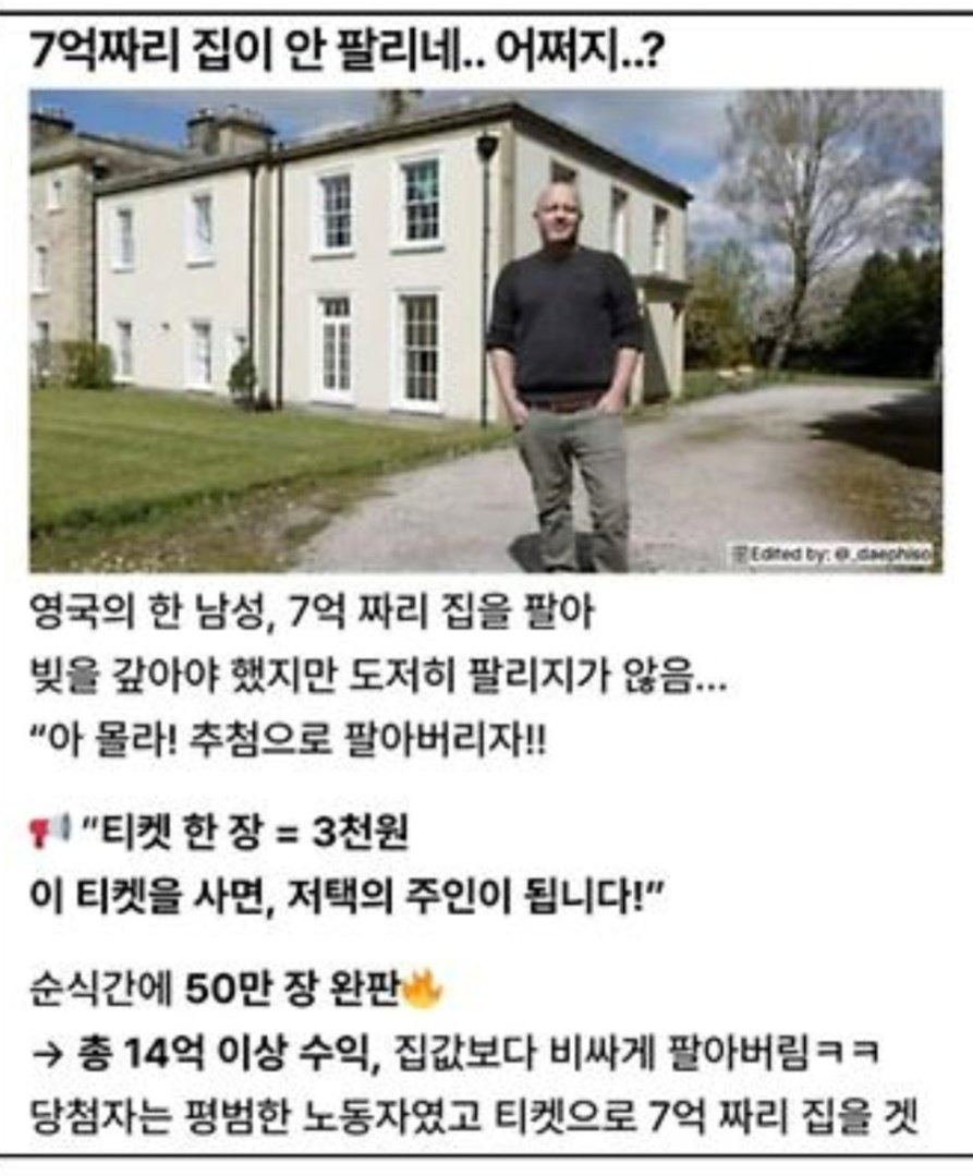 [흥미돋]7억짜리 집을 14억으로 만든 방법 작성자작고작은|작성시간26.02.13|조회수21,764 목록 댓글 46 글자크기 작게가 글자크기 크게가 출처: https://x.com/Rhayuumi/status/2021886176823795757 복권식으로 7억짜리 집을 얻을 수 있는 티켓을 만들어서 판매총 14억원 이상의 수익을 얻고 팔아버림 다음검색 현재 게시글 추가 기능 열기 북마크 공유하기 신고 센터로 신고 댓글 댓글 46 댓글쓰기 답글쓰기 댓글 리스트 작성자High Skool | 작성시간 26.02.13 ㅈㄴ똑똑하네 작성자아아시럽추가 | 작성시간 26.02.13 당첨자 판매자 둘 다 행복해졌네 작성자seeyouinmydream | 작성시간 26.02.13 와 신박하다 작성자드디어금요일 | 작성시간 26.02.13 와 작성자차밍핑 | 작성시간 26.02.14 와 어케그런생각을했지 댓글 전체보기