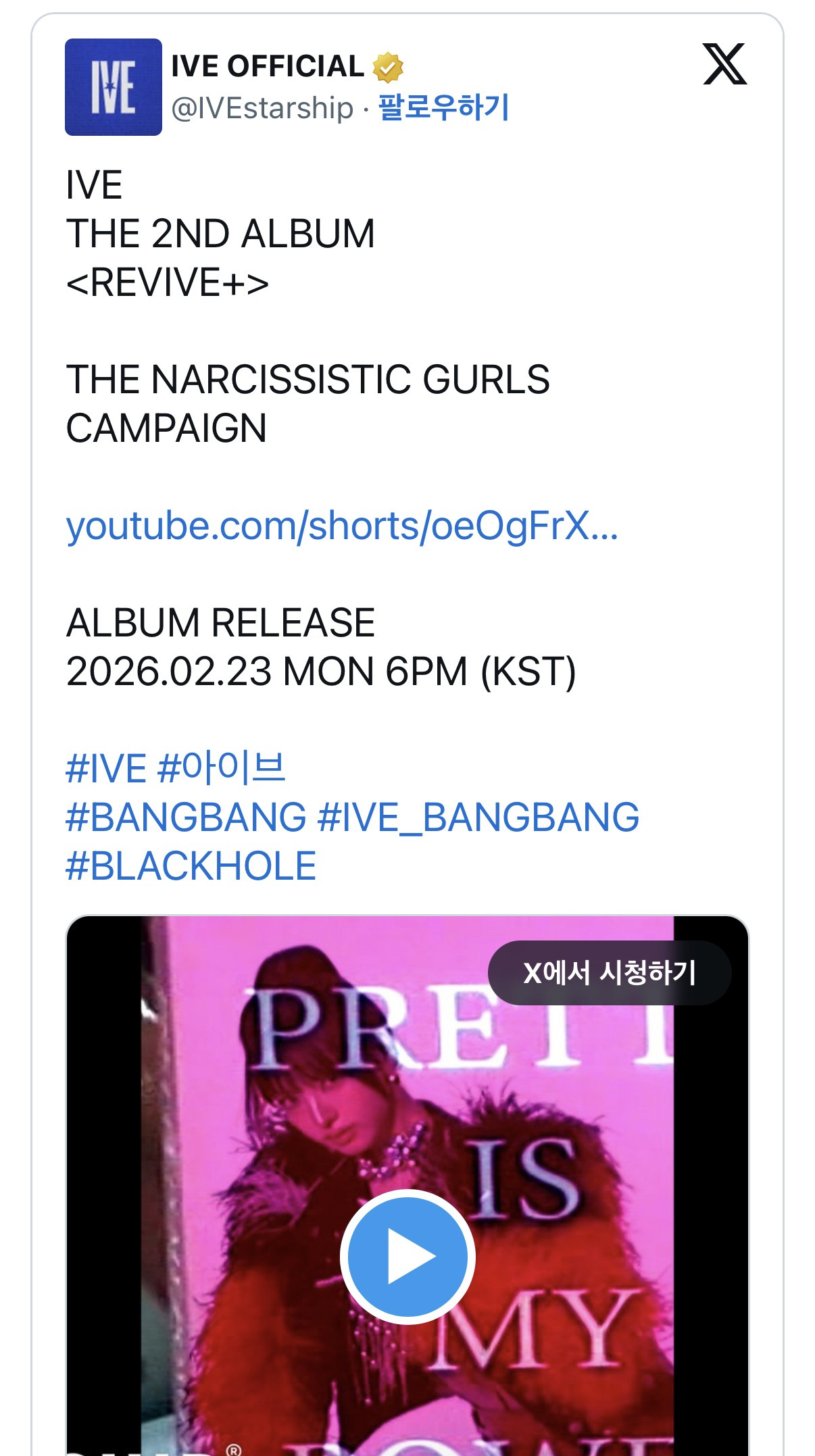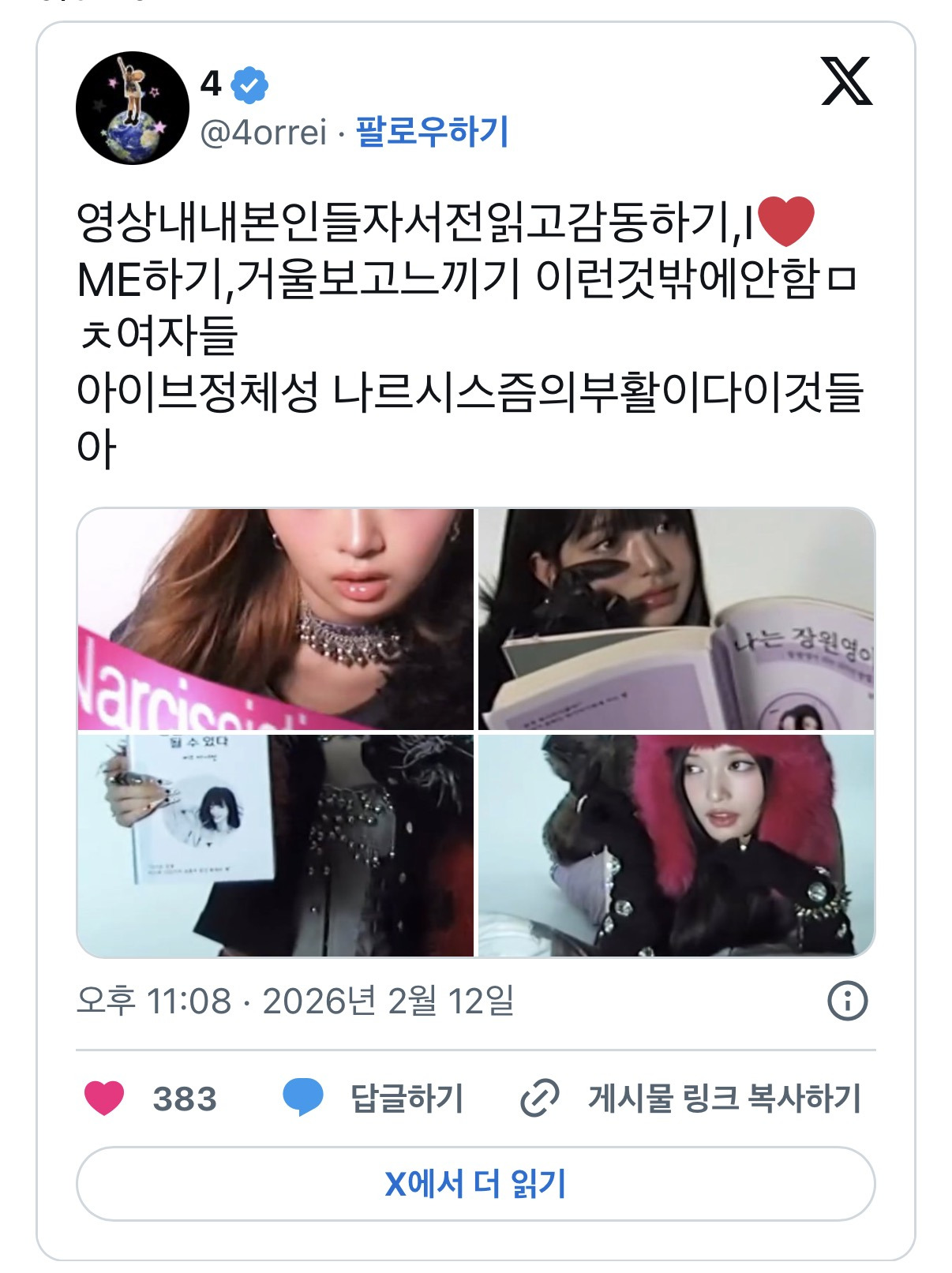 [흥미돋]아이브정체성 나르시시시즘의부활이다이것들아.twt 작성자합격했다|작성시간26.02.13|조회수15,413 목록 댓글 30 글자크기 작게가 글자크기 크게가 출처: https://theqoo.net/square/4093772870사진 누르면 출처로 이동어제 뜬 THE NARCISSISTIC GURLS CAMPAIGN 영상본인 자서전 읽고 감동하기 < 이게 아이브 코어야 ㅇㅇ 다음검색 현재 게시글 추가 기능 열기 북마크 공유하기 신고 센터로 신고 댓글 댓글 30 댓글쓰기 답글쓰기 댓글 리스트 작성자Rubyjane | 작성시간 26.02.13 이거라고 ㅠㅠㅠㅠ너무좋다 작성자그런 일로 전화하지 마세요 | 작성시간 26.02.13 유쾌하닼ㅋㅋㅋㅋㅋㅋㅋㅋㅋㅋㅋ 작성자소고기먹었지롱 | 작성시간 26.02.13 귀엽닼ㅋㅋㅋㅋㅋ책 진짜 잘만들엇어 작성자조울증 | 작성시간 26.02.13 사랑노레아닌게 개큰호감임 ㅠ 작성자작작하세요 | 작성시간 26.02.14 길을 비켜라 잡것들아 댓글 전체보기