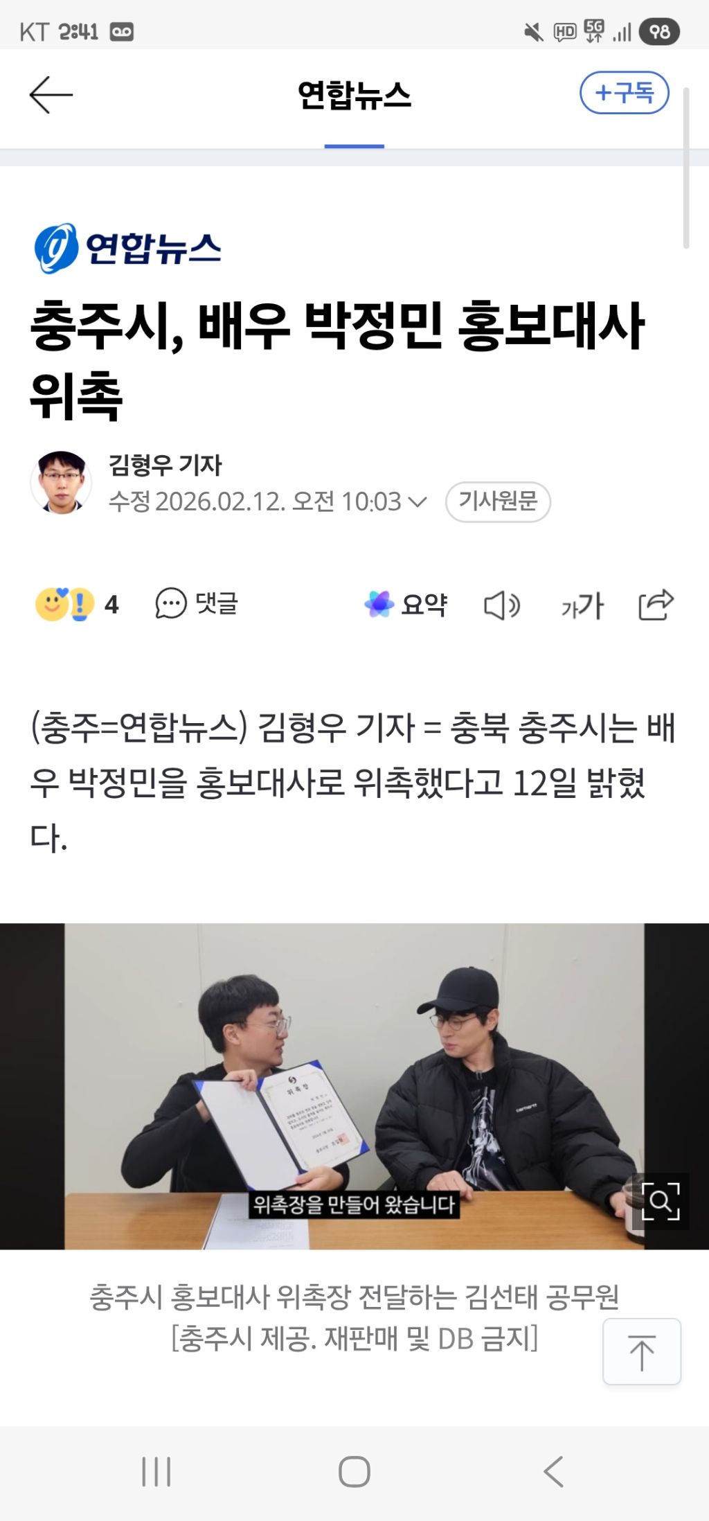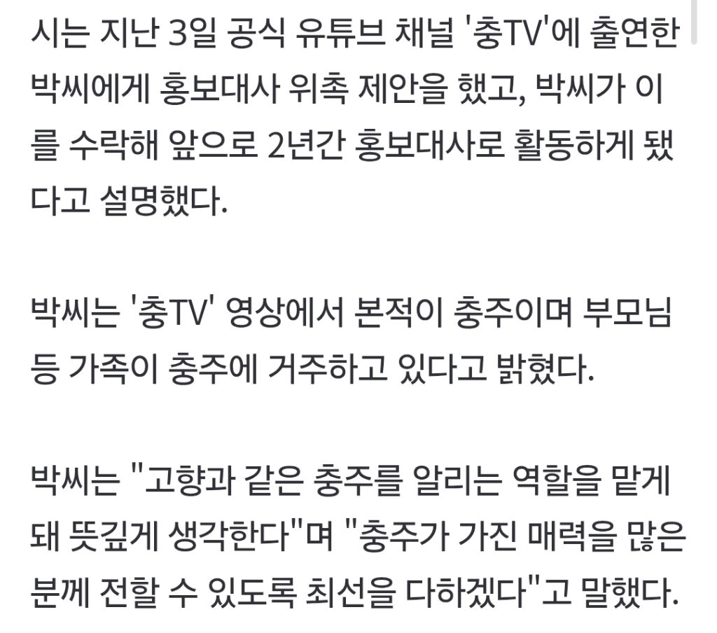 [여시뉴스데스크]충주시, 배우 박정민 홍보대사 위촉 작성자퇴사하고싶고그런상태|작성시간26.02.13|조회수18,471 목록 댓글 5 글자크기 작게가 글자크기 크게가 출처: 여성시대 https://naver.me/5XcdqkbF충주시, 배우 박정민 홍보대사 위촉충북 충주시는 배우 박정민을 홍보대사로 위촉했다고 12일 밝혔다. 시는 지난 3일 공식 유튜브 채널 '충TV'에 출연한 박씨에게 홍보대사 위촉 제안을 했고, 박씨가 이를 수락해 앞으로 2년간 홍보n.news.naver.com 다음검색 현재 게시글 추가 기능 열기 북마크 공유하기 신고 센터로 신고 댓글 댓글 5 댓글쓰기 답글쓰기 댓글 리스트 작성자Why you go so far away | 작성시간 26.02.13 마지막 선물 같은건가ㅋㅋㅋ 작성자오지는오지명 | 작성시간 26.02.13 본적 충주였구나? 얼굴이 충주남관상이긴했음ㅋㅋㅋㅋㅋㅋㅋㅋㅋ 작성자미역미역국 | 작성시간 26.02.13 ㄹㅇ 어쩐지 마지막 선물이었나봄 작성자완자퀸카 | 작성시간 26.02.13 이러고충주맨은 감 작성자귀여운고양이 | 작성시간 26.02.13 충주맨 댓글 전체보기