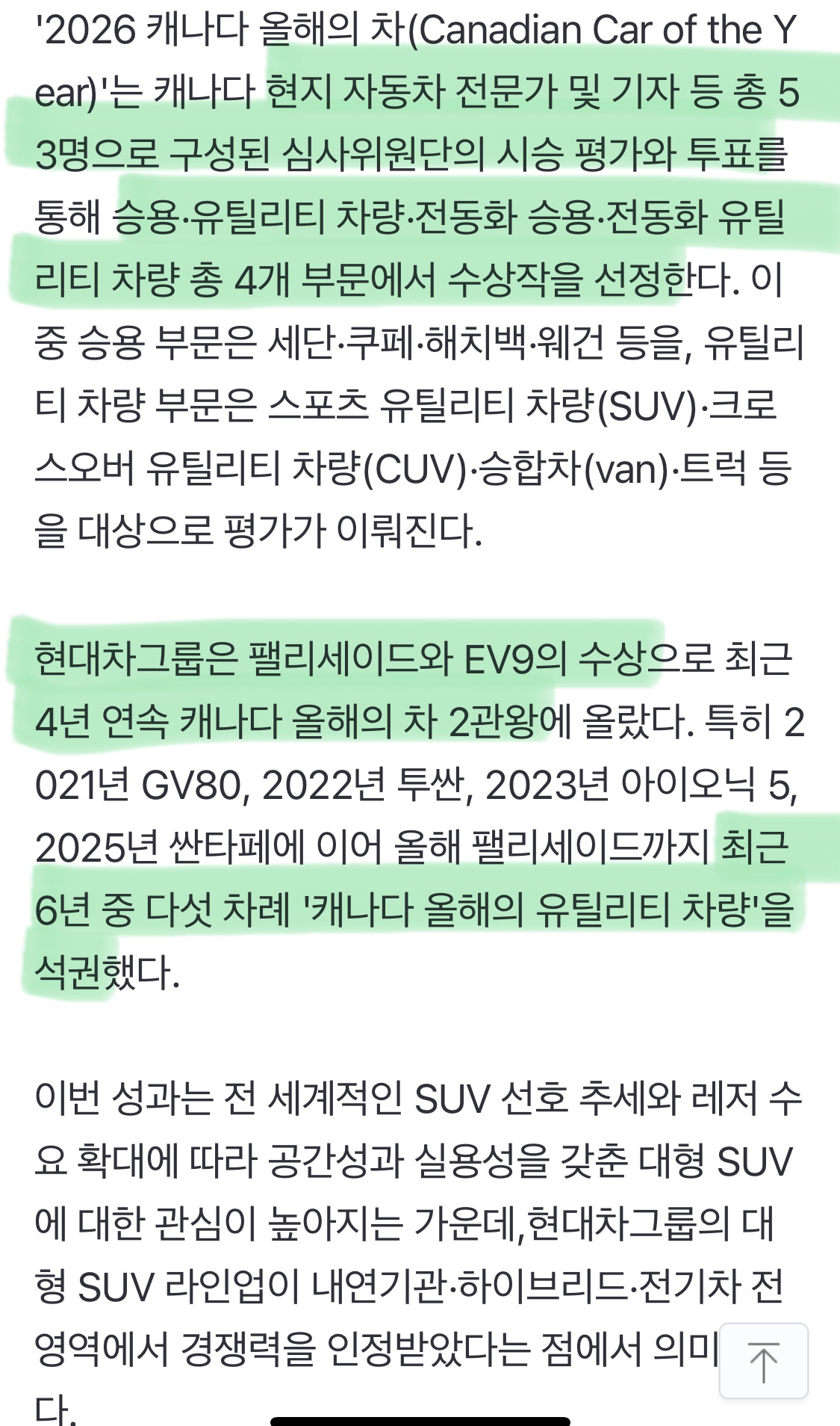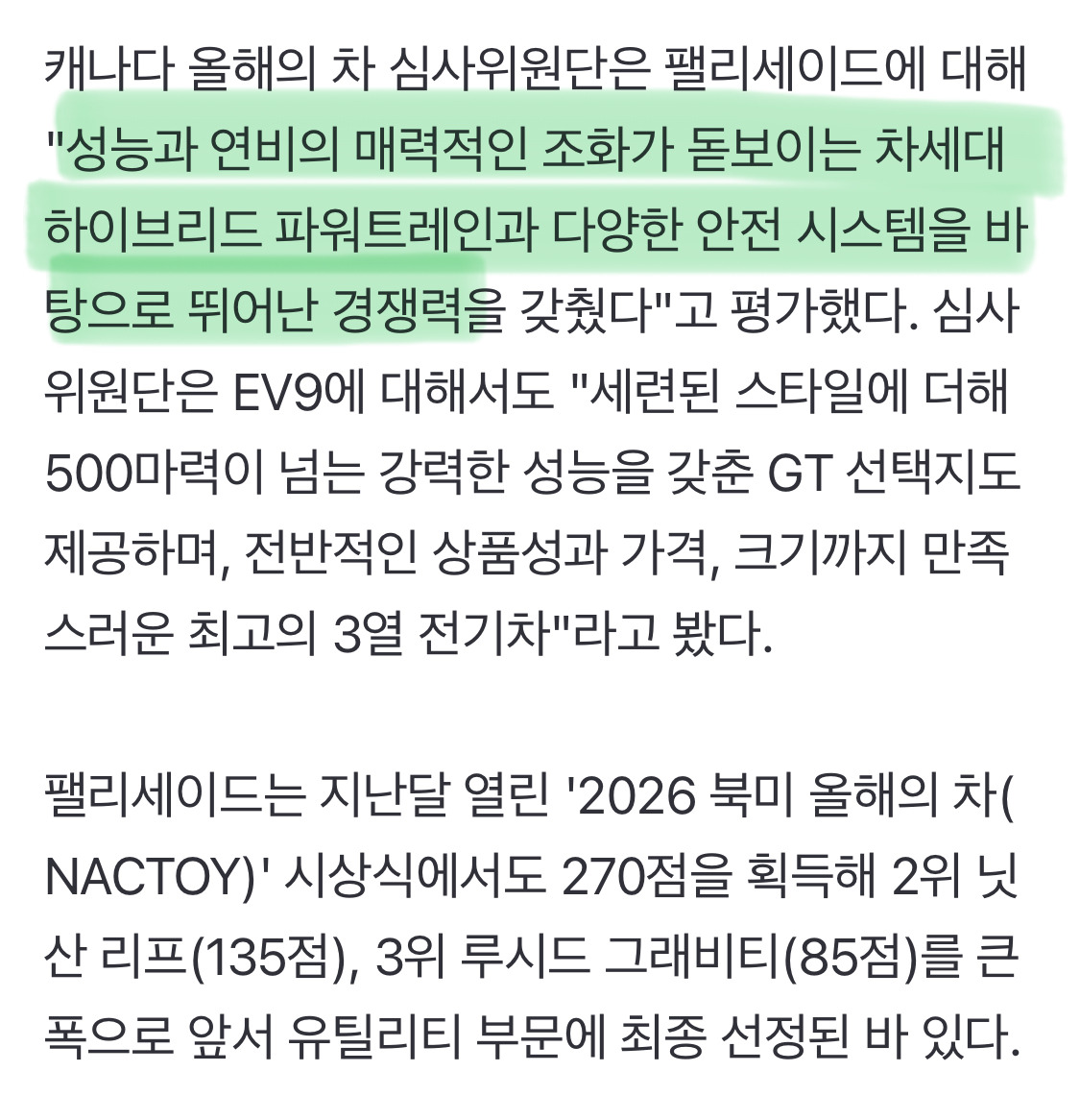 [여시뉴스데스크]현대차 팰리세이드, EV9 '캐나다 올해의 차' 동시 석권 작성자(본인닉네임).|작성시간26.02.13|조회수4,633 목록 댓글 6 글자크기 작게가 글자크기 크게가 출처: https://n.news.naver.com/article/079/0004115916?sid=101 다음검색 현재 게시글 추가 기능 열기 북마크 공유하기 신고 센터로 신고 댓글 댓글 6 댓글쓰기 답글쓰기 댓글 리스트 작성자오마위아래 | 작성시간 26.02.13 개뚱띠차 내앞에있으면 뚱띠라고 맨날 놀림 옆으로퍼진느낌이라그런가 ㅋㅋㅋㅋ 작성자꺄호 | 작성시간 26.02.13 우리집 뚱땡이 화이팅 작성자차돌이좋아 | 작성시간 26.02.13 예쁨 작성자비성수기 | 작성시간 26.02.13 펠리세이드 디자인은 2021년식이 깔끔하니 내 스타일이었는데 갈수록 모르겠다. 내가 디자인을 잘 몰라서 그런가봄ㅎㅎ 작성자얼먹소다 | 작성시간 26.02.13 이브이 시리즈 아자아자 화이팅! 댓글 전체보기