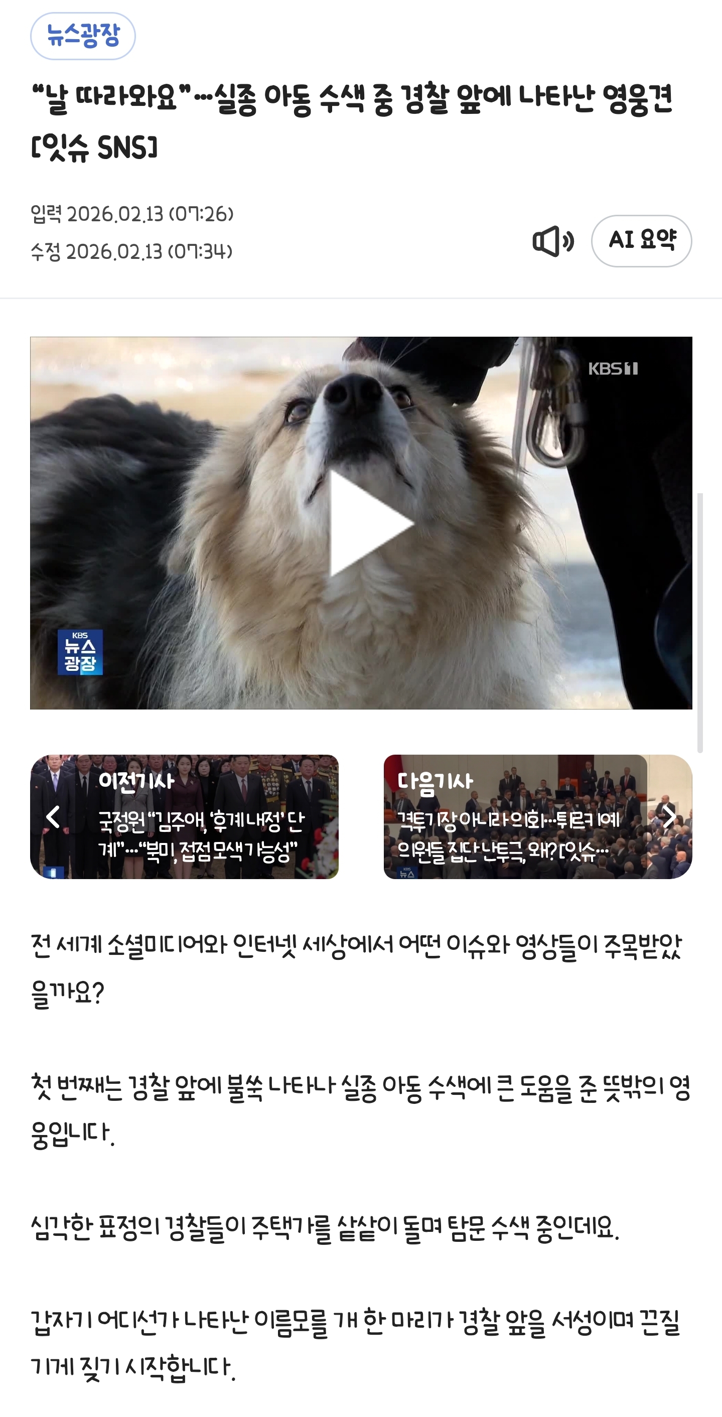 [여시뉴스데스크]“날 따라와요”…실종 아동 수색 중 경찰 앞에 나타난 영웅견 [잇슈 SNS] 작성자하늘땅별땅땅땅땅|작성시간26.02.13|조회수8,996 목록 댓글 16 글자크기 작게가 글자크기 크게가 출처: https://news.kbs.co.kr/news/mobile/view/view.do?ncd=8485483“날 따라와요”…실종 아동 수색 중 경찰 앞에 나타난 영웅견 [잇슈 SNS]전 세계 소셜미디어와 인터넷 세상에서 어떤 이슈와 영상들이 주목받았을까요? 첫 번째는 경찰 앞에 불쑥 ...news.kbs.co.kr따봉강쥐야 고마워 다음검색 현재 게시글 추가 기능 열기 북마크 공유하기 신고 센터로 신고 댓글 댓글 16 댓글쓰기 답글쓰기 댓글 리스트 작성자말랑도마뱀 | 작성시간 26.02.13 와 영상보니까 진짜 따라오라고 가다가 돌아보고 하네 작성자ASM R | 작성시간 26.02.13 착하고 똑똑해ㅠㅠ 작성자두비두비밥 | 작성시간 26.02.13 똑똑강쥐 ㅜㅜ 작성자잘안보임 | 작성시간 26.02.13 따봉강쥐 똑똑강쥐 영웅강쥐 작성자우리글 훔쳐가는 짭시도둑새끼들 | 작성시간 26.02.13 와 진짜 똑똑하다ㅠㅠㅠㅠ 따봉강쥐ㅠㅠㅠㅠ 댓글 전체보기