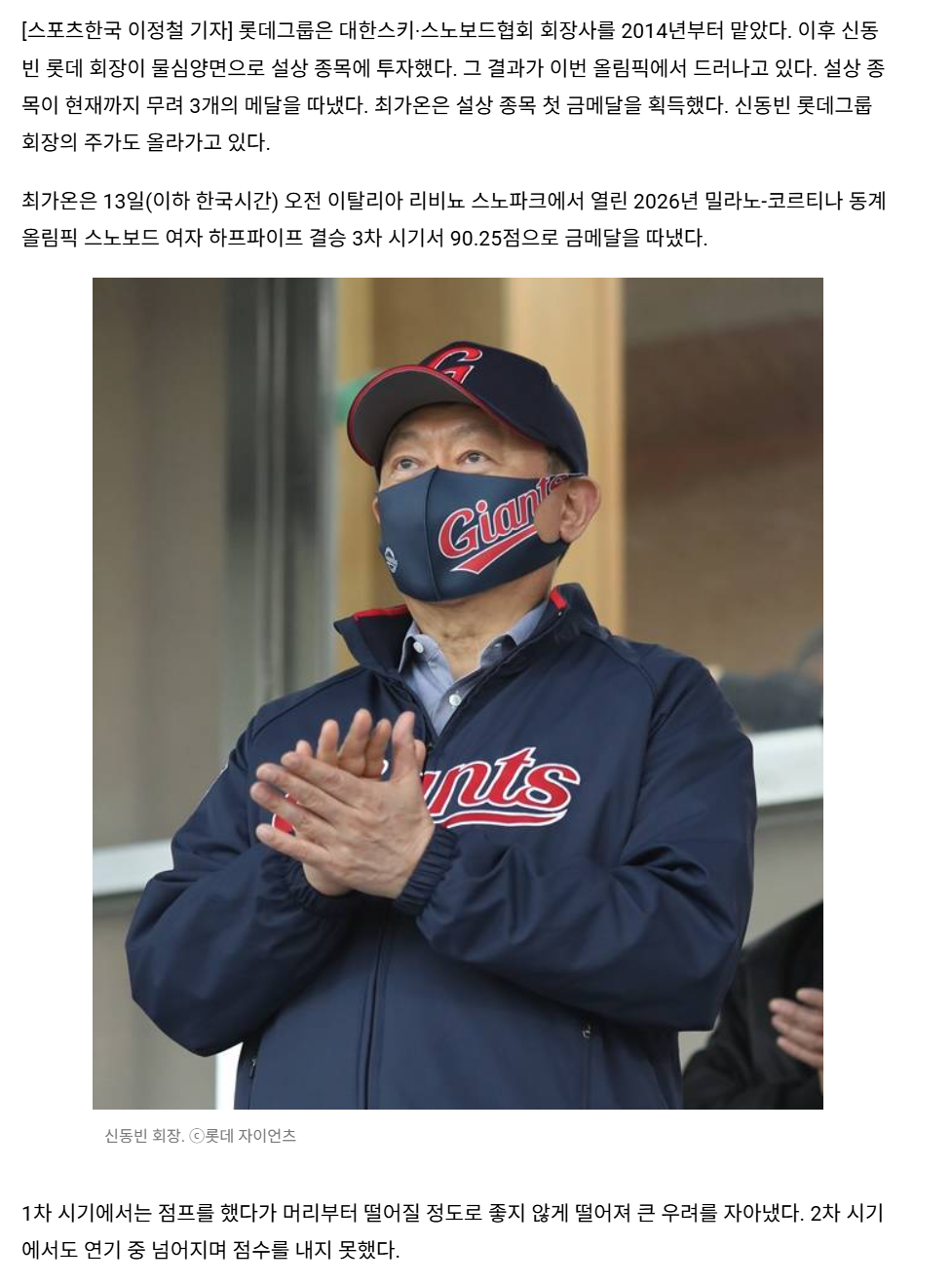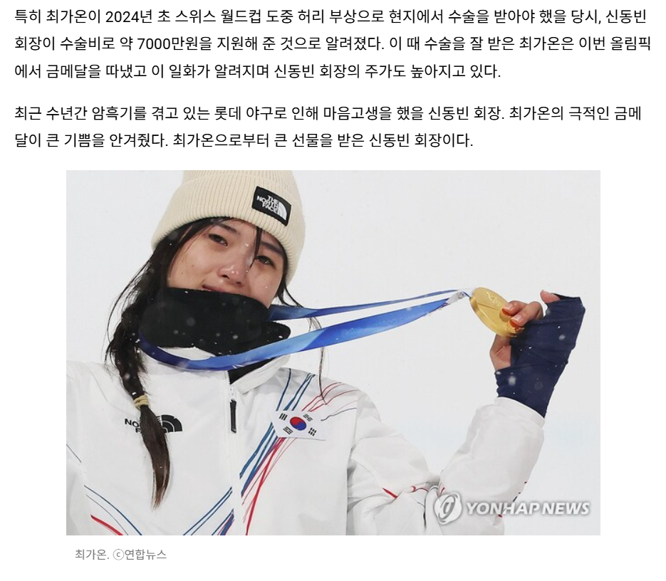 [여시뉴스데스크]롯데 야구로 느꼈던 아픔, 최가온으로 치유했네... 주가 높인 신동빈 회장 작성자꺄요르힝꺄르를|작성시간26.02.13|조회수10,250 목록 댓글 20 글자크기 작게가 글자크기 크게가 출처: https://sports.hankooki.com/news/articleView.html?idxno=6925261롯데 야구로 느꼈던 아픔, 최가온으로 치유했네… 주가 높인 신동빈 회장 - 스포츠한국[스포츠한국 이정철 기자] 롯데그룹은 대한스키·스노보드협회 회장사를 2014년부터 맡았다. 이후 신동빈 롯데 회장이 물심양면으로 설상 종목에 투자했다. 그 결과가 이번 올림픽에서 드러나고 sports.hankooki.com(중략) 다음검색 현재 게시글 추가 기능 열기 북마크 공유하기 신고 센터로 신고 댓글 댓글 20 댓글쓰기 답글쓰기 댓글 리스트 작성자캣보스 | 작성시간 26.02.13 오늘 기사보니까 또 아프겠던데 작성자아이바오러바오푸바오 | 작성시간 26.02.13 하 아프네요 작성자예… | 작성시간 26.02.13 제목 ㅠㅋㅋㅋ 작성자계절 틈에 잠시 피는 낯선꽃처럼 | 작성시간 26.02.13 이제 야구 버려요 가온이한테 다 투자해 작성자두바이쫀득찹쌀떡 | 작성시간 26.02.13 제목ㅋㅋㅋㅋㅋ 댓글 전체보기