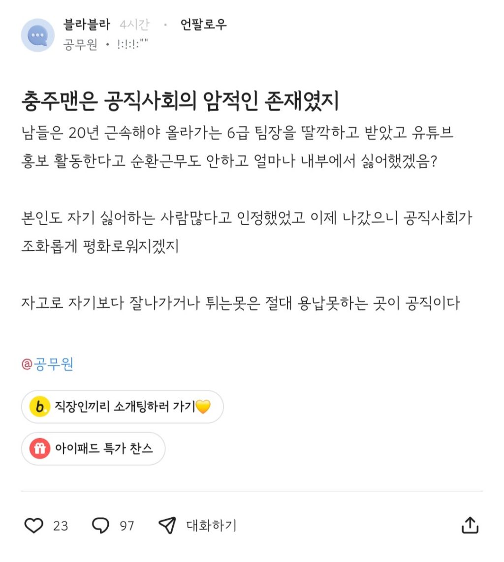 글삭한거보면 공직사회 비꼬는글도 아닌거 같은데