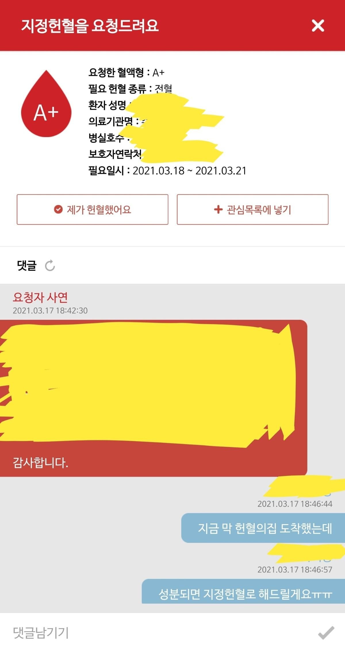 관심 목록에 넣거나 자기가 헌혈했다고 알려줄 수 있고