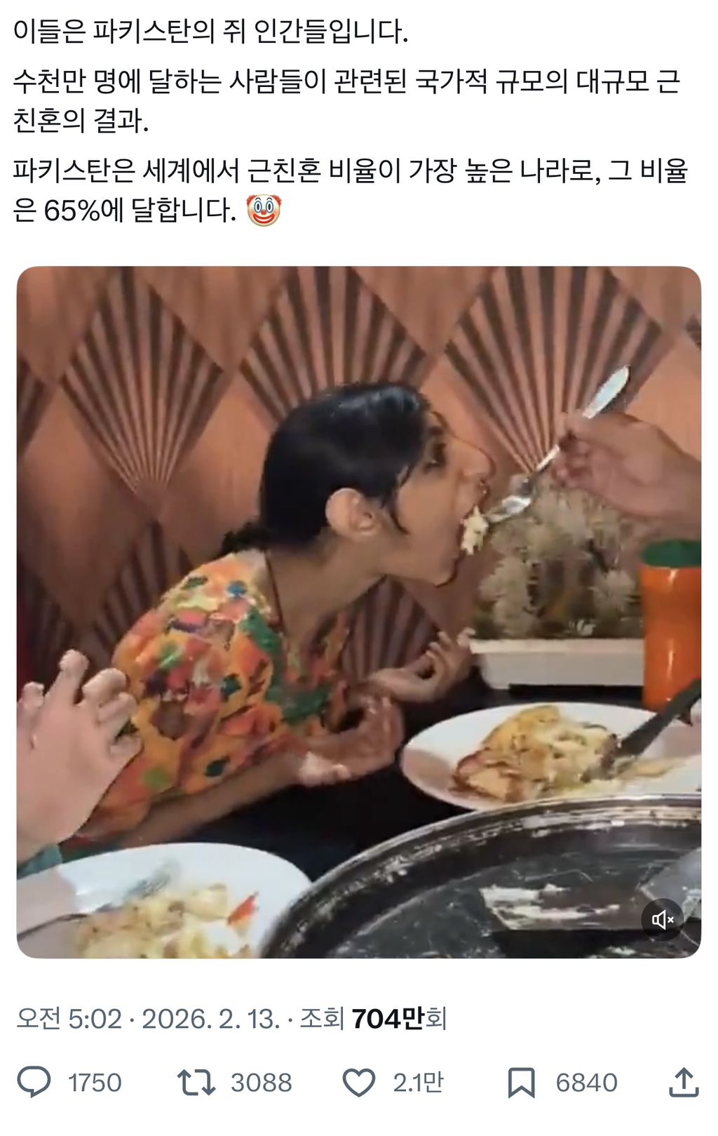 [기타]파키스탄의 근친혼으로 태어난 자녀들 작성자Rooose|작성시간26.02.13|조회수267,327 목록 댓글 56 글자크기 작게가 글자크기 크게가 출처: https://x.com/pseudo_prophet_/status/2022038498090651996?s=46&t=49r3Kw6TNqvpiTF8J4JDaA 다음검색 현재 게시글 추가 기능 열기 북마크 공유하기 신고 센터로 신고 댓글 댓글 56 댓글쓰기 답글쓰기 댓글 리스트 작성자구도훈정유원 | 작성시간 26.02.25 헐 넘 충격적;; 작성자햄버거악개애 | 작성시간 26.02.26 저게 나라임? 작성자황젠슨 | 작성시간 26.02.26 아니 진짜야...? 작성자은행구이 | 작성시간 26.02.26 아 토나와 🤮 작성자컴터어려워 | 작성시간 26.02.27 다른 무슬림 애들도 파키스탄 깔 때 사촌이랑 결혼하는 걸로 까더라진짜 심각한가봐 댓글 전체보기