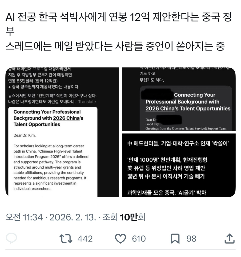작성자아아바라바라 작성시간 26.02.13 근데 중국 인구가 그렇게 많은데도 인재를 한국에서 넘보노;; 산업스파이도 아니고 걍 석박출신을....