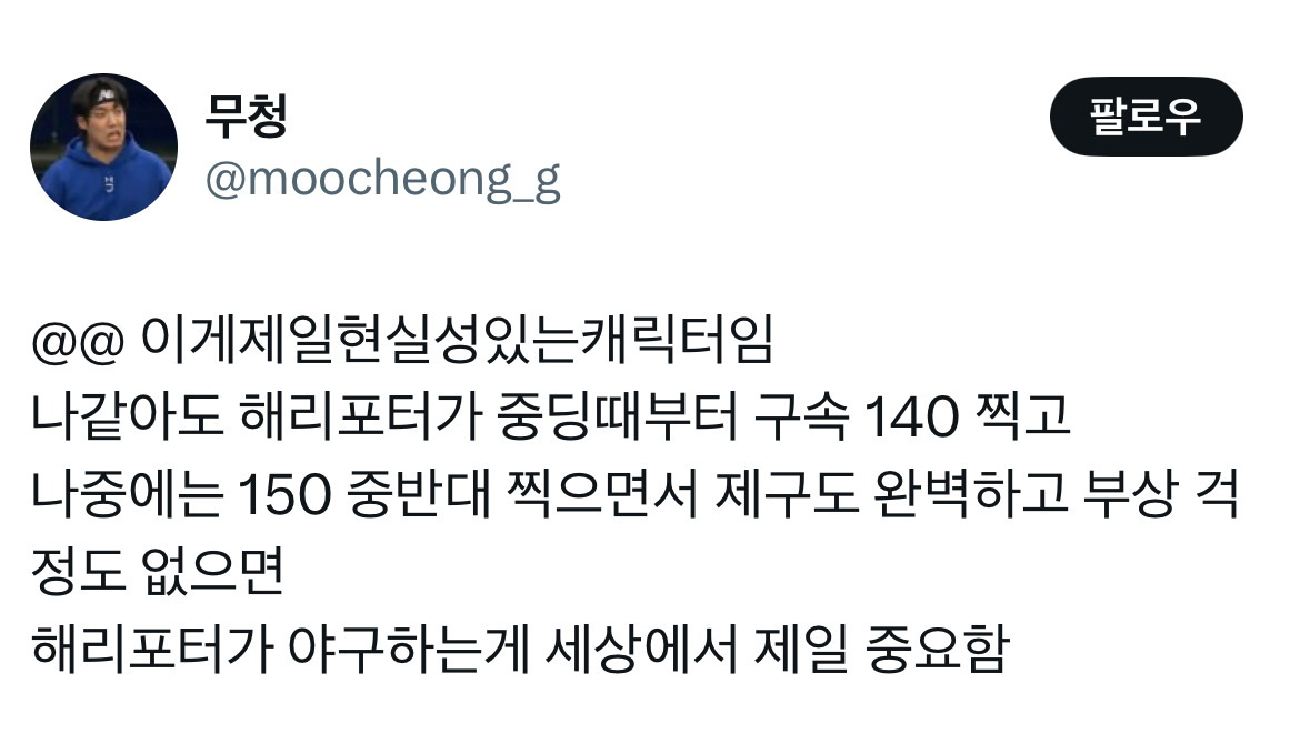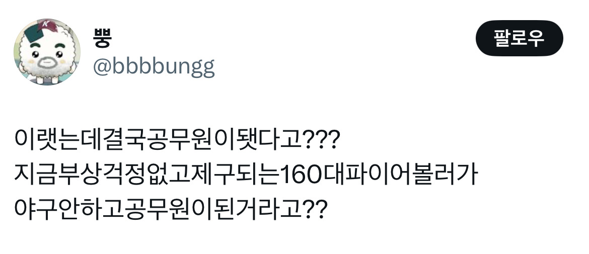작성자내가더잘할게는개뿔나만한사람없다 작성시간 26.02.14 하긴 좌완 160키로 던지는 제구력 개쩌는 투수가 고교야구, 청대 다 압살하고선 공무원 공부해서 임용됐다고 하면 어휴..