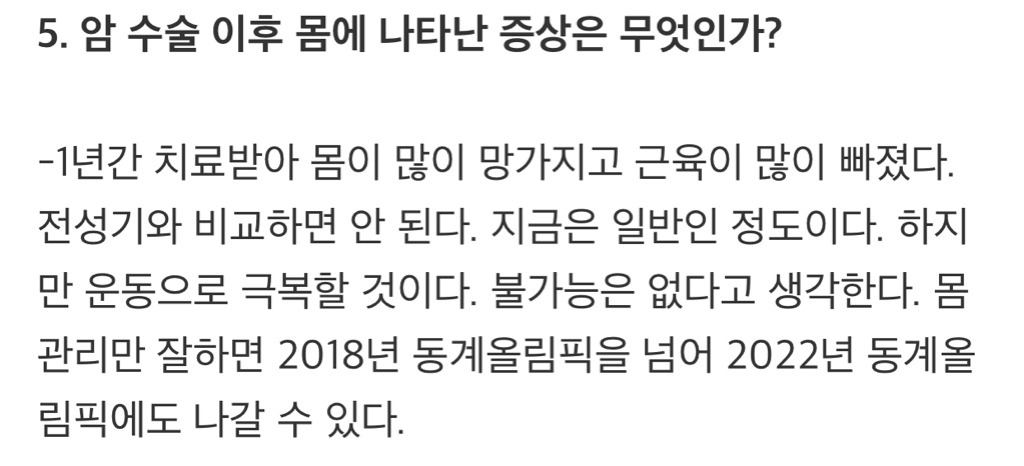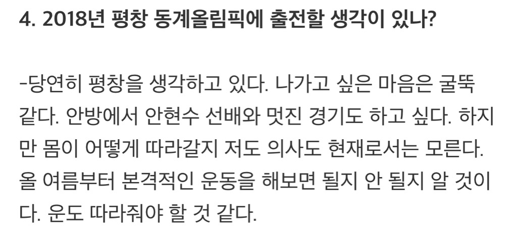 1년 후 매체와의 인터뷰에서 본인의 근황을 밝히며 열심히 몸관리만 잘하면 2018 평창올림픽을 넘어 2022년 올림픽까지 참가할 수 있다고 말할 만큼 쇼트트랙과 올림픽에 대한 의지가 뚜렷했어.