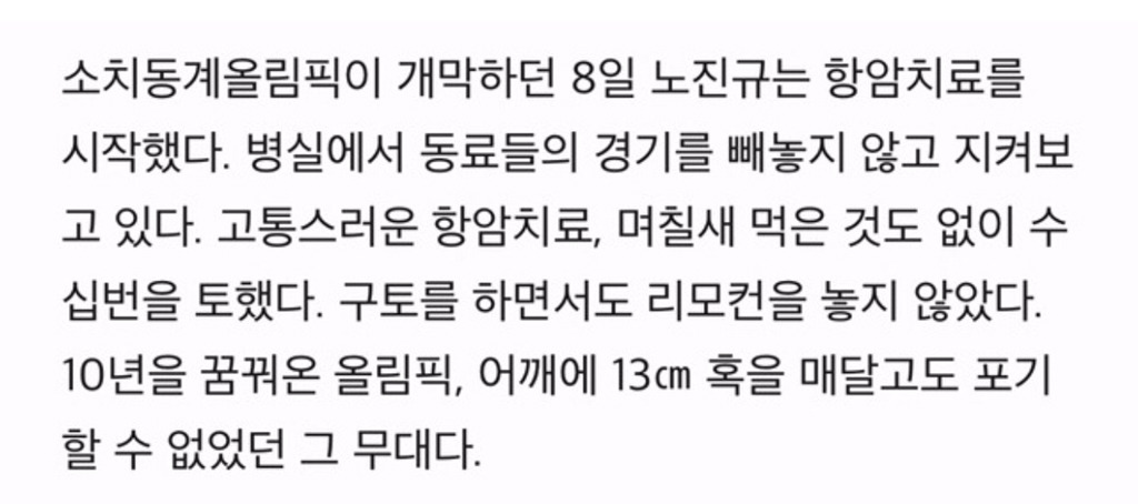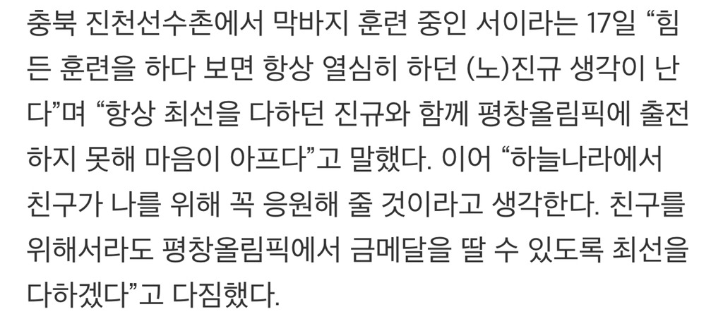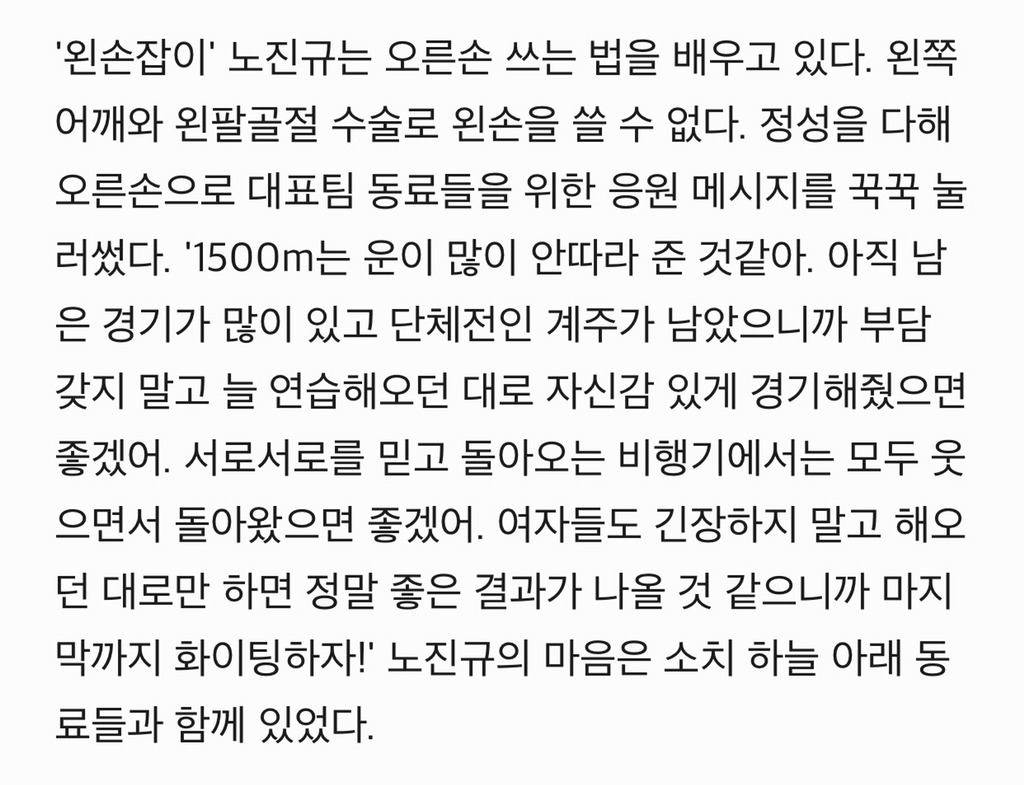 본인은 올림픽에 출전하지 못하게 됐지만 병실에 누워있는 와중에도 함께 훈련해왔던 동료 선수들을 위해 평소 안쓰던 손으로 편지도 쓰고 응원해줬어. 선수들 응원 많이 부탁드린다며 본인 SNS에 글을 올리기도 했었고.