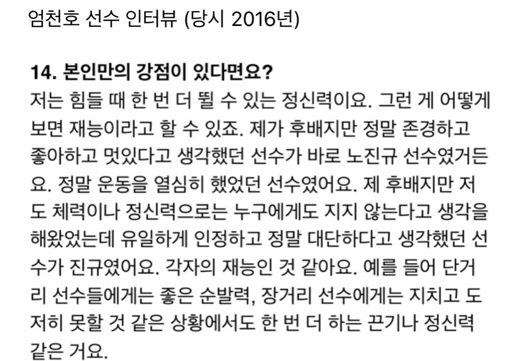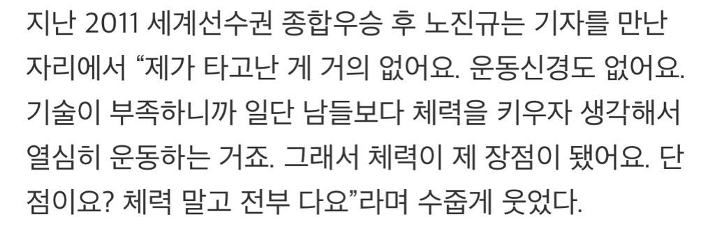 남들보다 다른 면에서 떨어지기 때문에 체력을 키우자 생각했다며 본인은 체력 외에는 장점이 없다며 겸손한 태도를 보였었어.