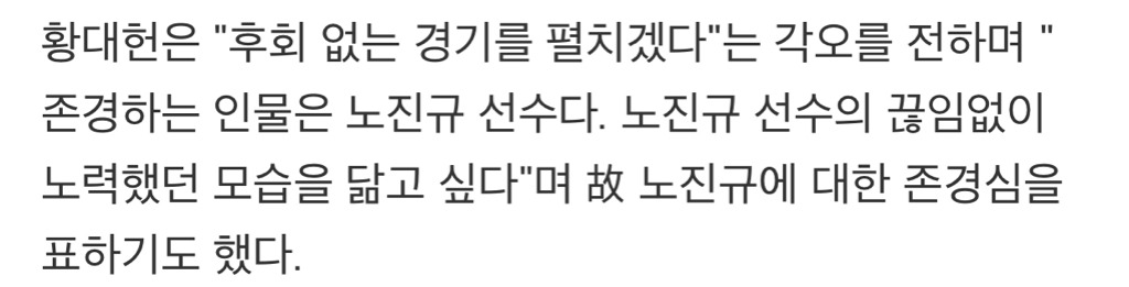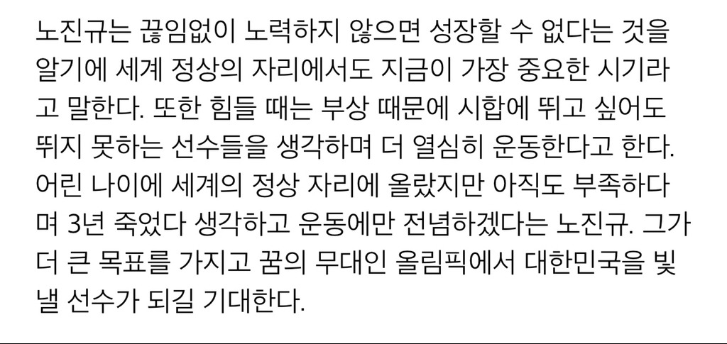 그런 그가 존경하는 선수는 빅토르안(안현수) 선수였고, 노진규 선수의 상승세가 이어지자 빅토르안과의 라이벌 구도를 만들며 민감한 질문을 묻는 상황에도 그는 “나이가 많다고 부상이 있다고 해서 그를 과소평가 해서는 안된다. 하지만 너무 과대평가 하지도 않을 것이다”라며 빅토르안과 함께 평창 올림픽에 출전해 겨뤄보고 싶다는 뜻을 밝히기도 했어.