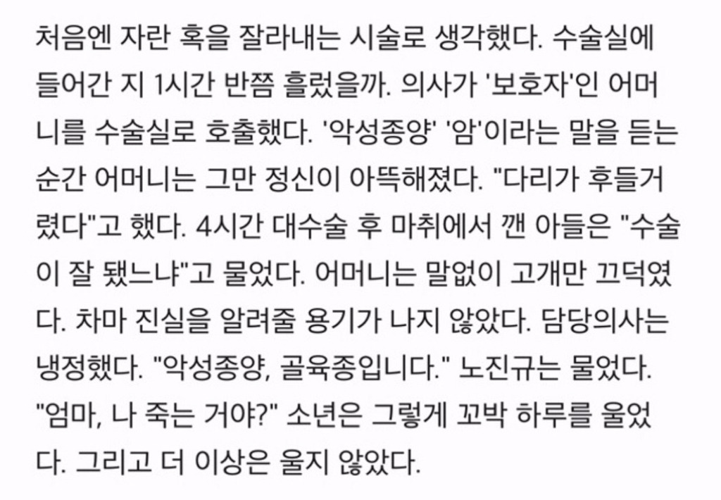 단순부상인줄만 알았던 어깨가 통증이 심해지면서 병원에 가게 되었고 처음엔 양성종양이라는 진단을 받았지만, 이후 치료가 늦어지면서 악성종양 진단을 받게 돼. 노진규 선수가 앓았던 병은 골육종으로 흔히 뼈에 암이 생기는 ‘뼈암’이라고도 해.