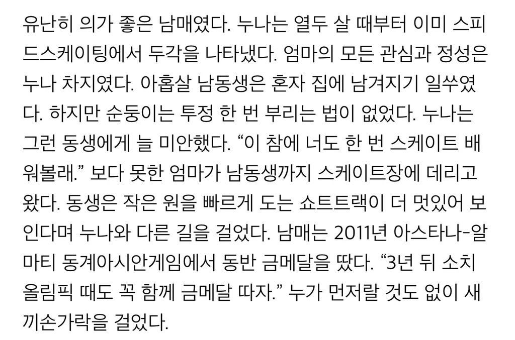 동생의 꿈을 이뤄주기 위해 벗었던 스케이트화를 다시 신은 친누나 노선영 선수와