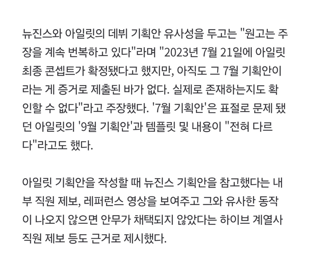 법원에서 기획안을 본 것은 사실이며 그렇기에 (뉴진스)기획안을 반영했다는 것을 배제할 수 없고