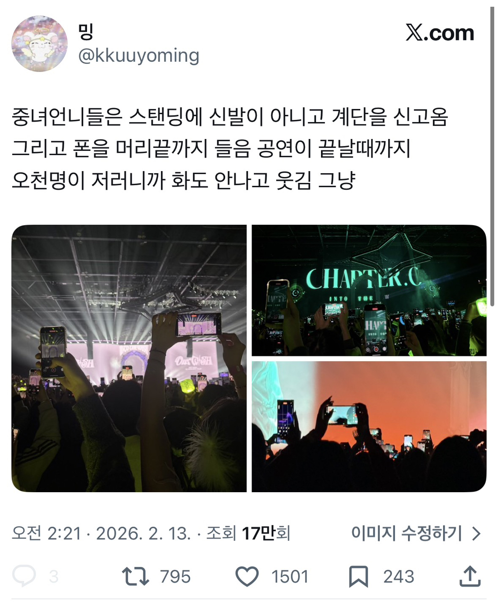 작성자오늘도개미는(뚠뚠) 작성시간 26.02.14 이래서 좌석제가 좋음.. 몇시간을 고개 처들고 서있는거 고문아니면 뭐임..
